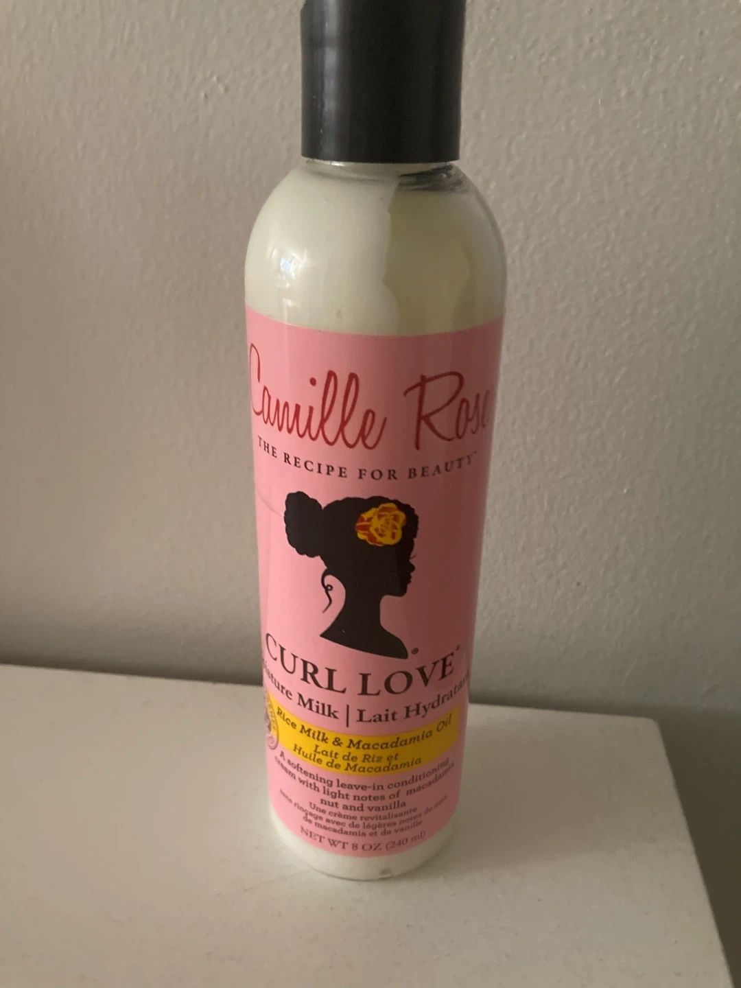 Selling a bottle of Camille Rose Curl Love Moisture Milk! This softening leave-in conditioner is infused with rice milk and macadamia oil. It has light notes of macadamia nut and vanilla. The bottle contains 8 oz (240 ml) of product