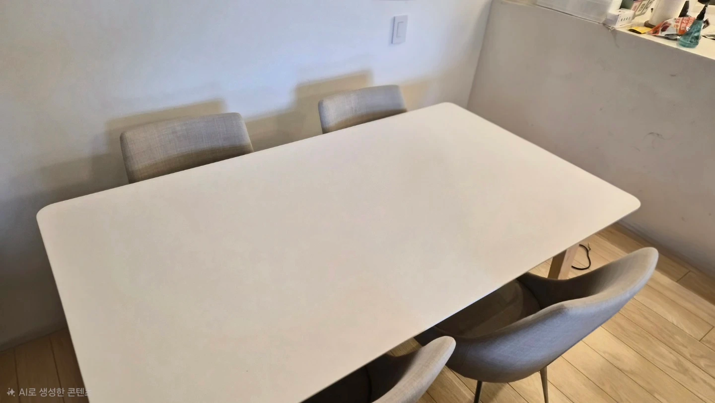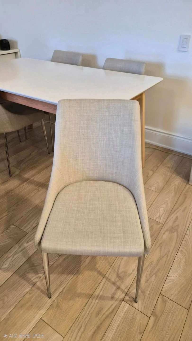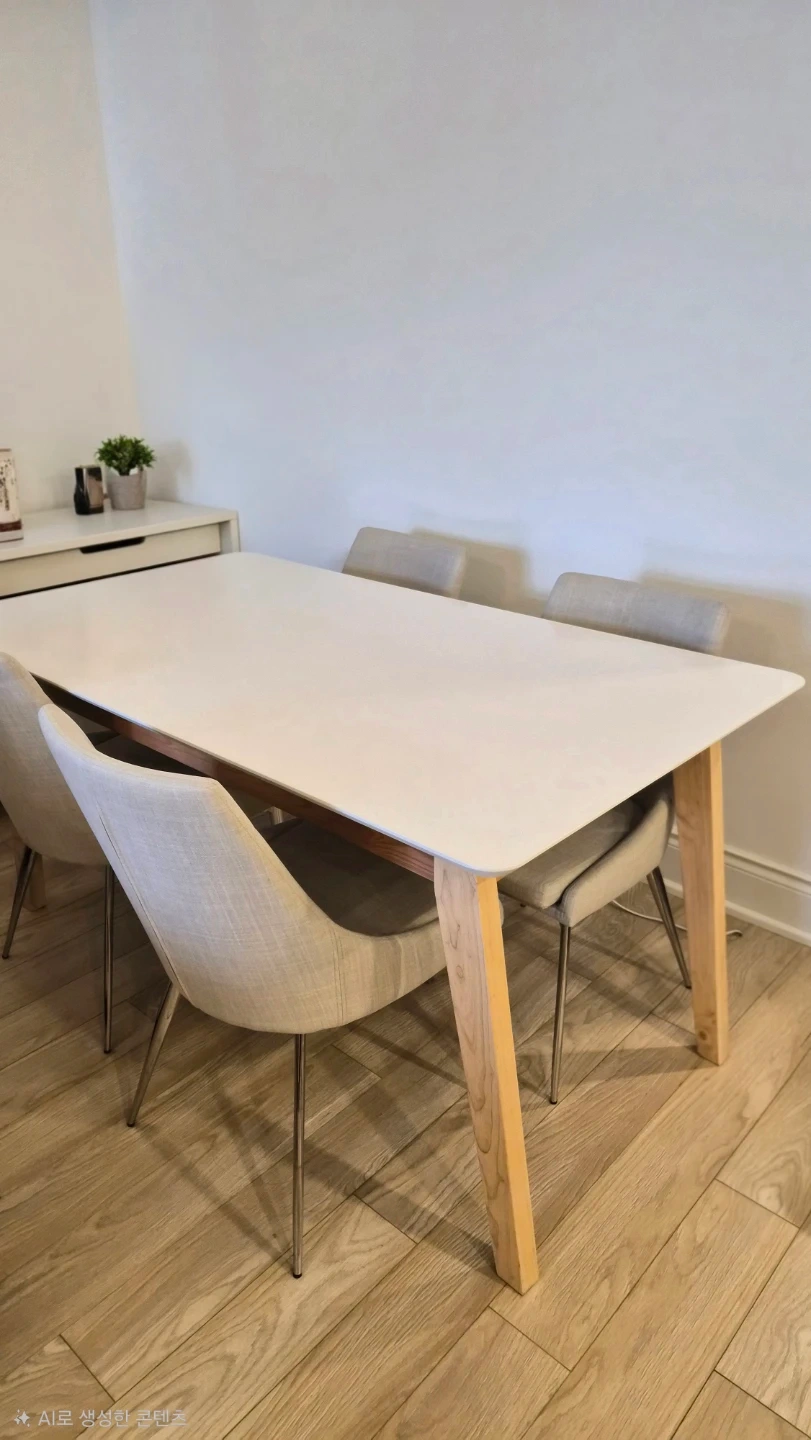 Selling a structube dining table with four chairs. The chairs are a neutral beige grey blended colour with metal legs. The table has a white top and wooden legs. It's in great condition and would be perfect for a small dining area or kitchen nook