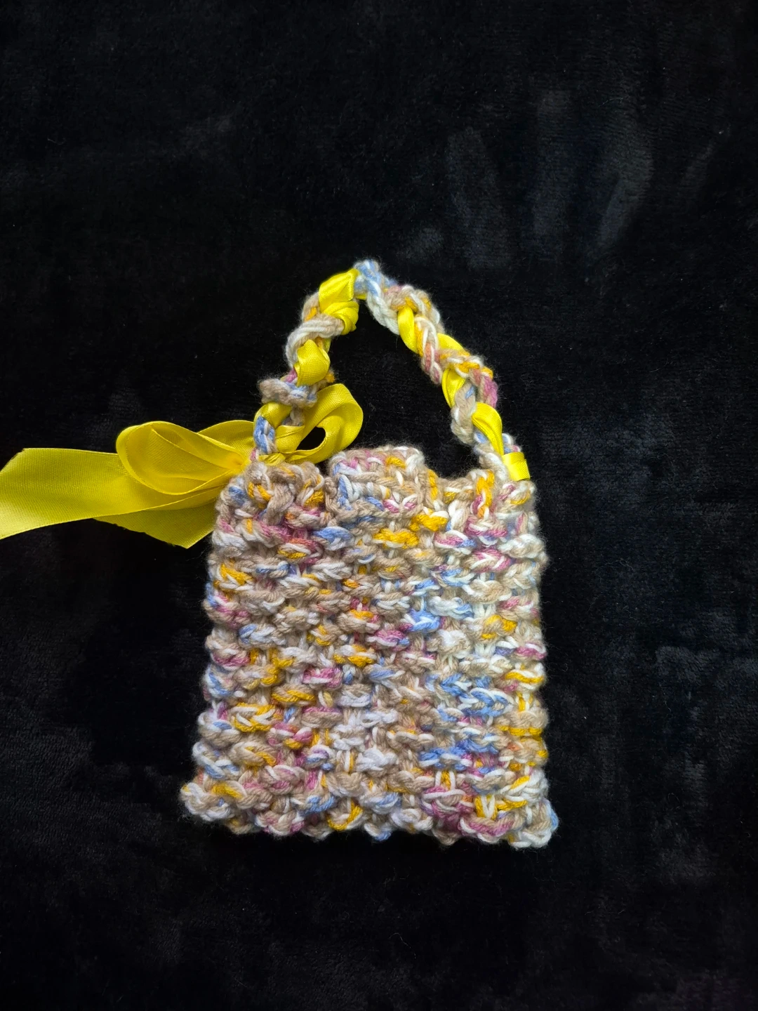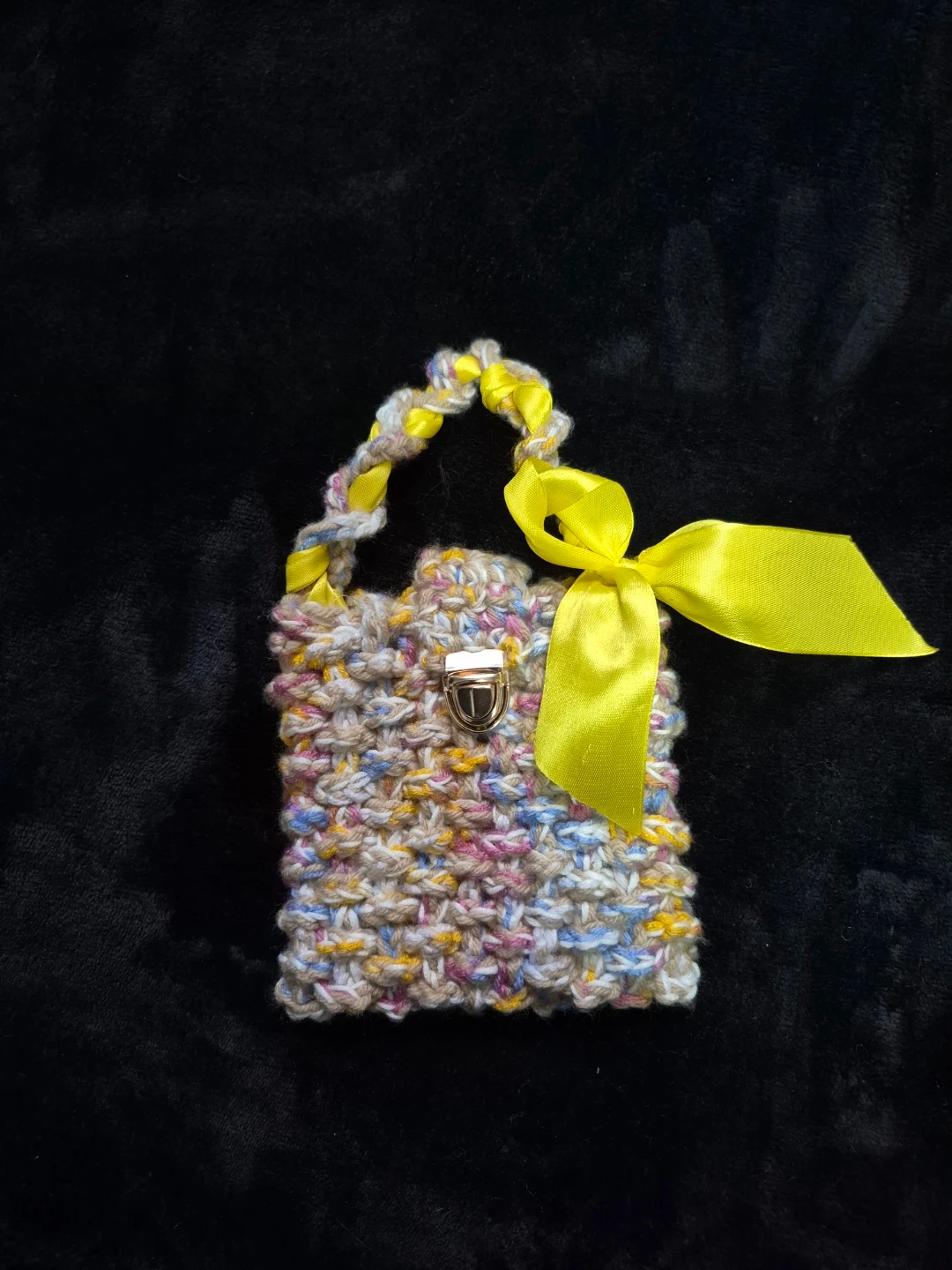 This is a cute, handmade crocheted mini bag! It features a colorful, textured knit pattern and a bright yellow ribbon accent. Perfect for adding a touch of whimsy to your outfit or as a unique little gift