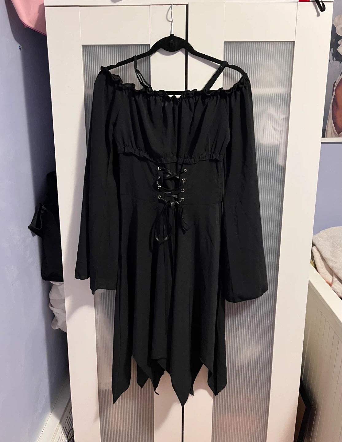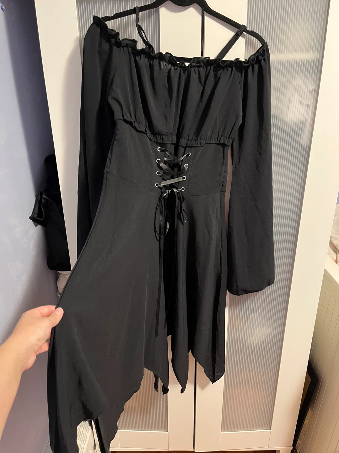 Selling a beautiful black dress with a corset-style lace-up design! It has long sleeves and an off-the-shoulder ruffle detail. It's in great condition and would be perfect for a night out or a special occasion ☑️ size L