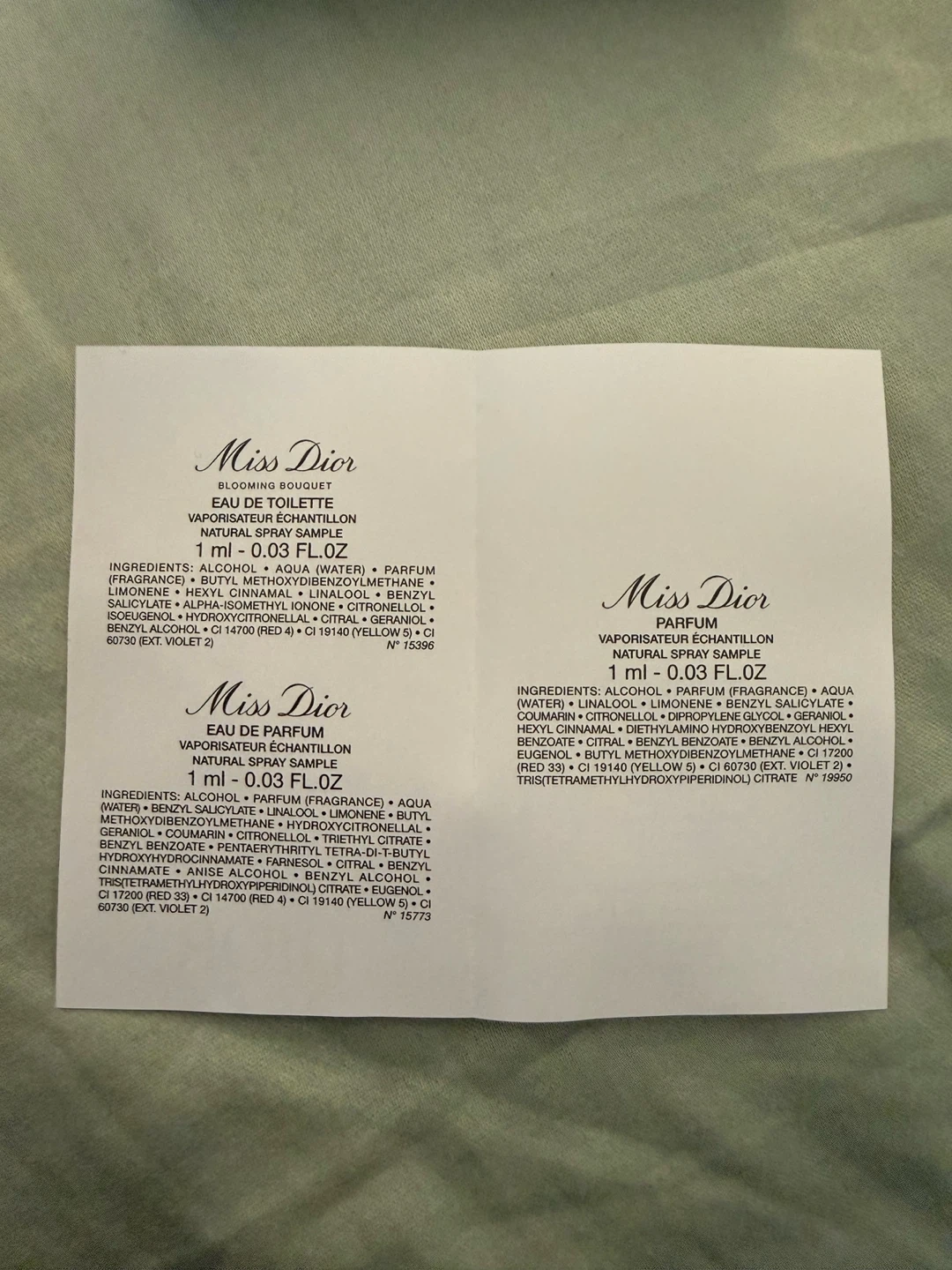 Selling a set of Miss Dior samples! Includes a variety of Eau de Parfum and Eau de Toilette samples, perfect for trying out the fragrance before committing to a full bottle. Each sample is of 1 mL size. Comes with the original box and a cute Miss Dior pouch!