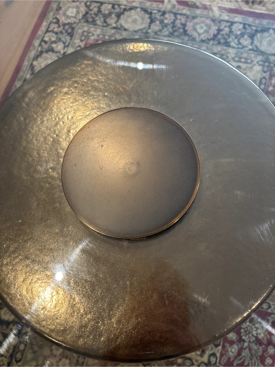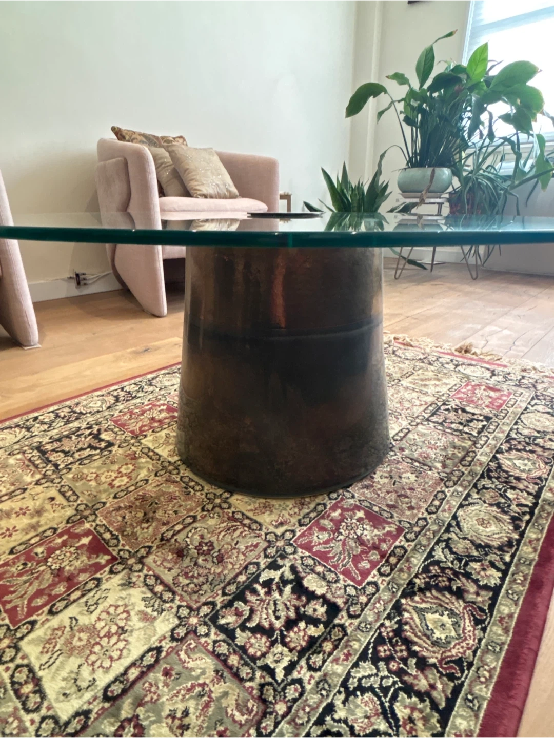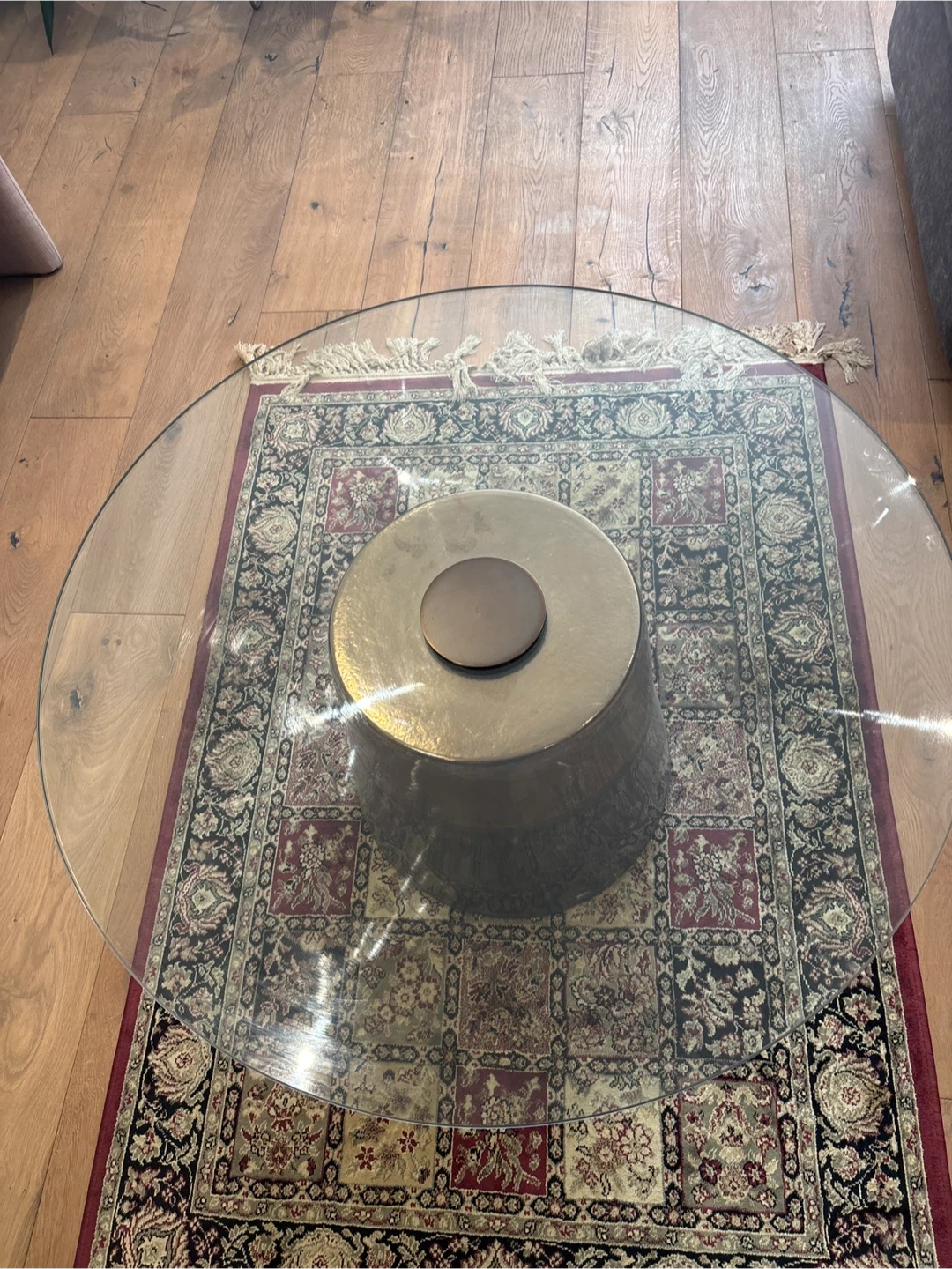 Selling a West Elm glass top coffee table with a unique metal base. It's a stylish piece that would look great in any living room. The table is in good condition and ready for a new home! Diameter is 36 inches
