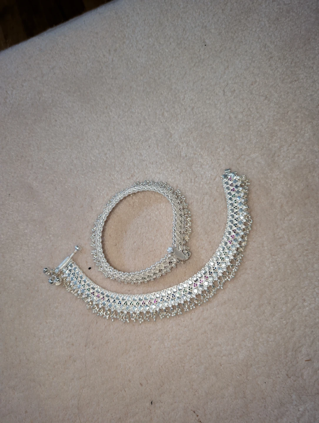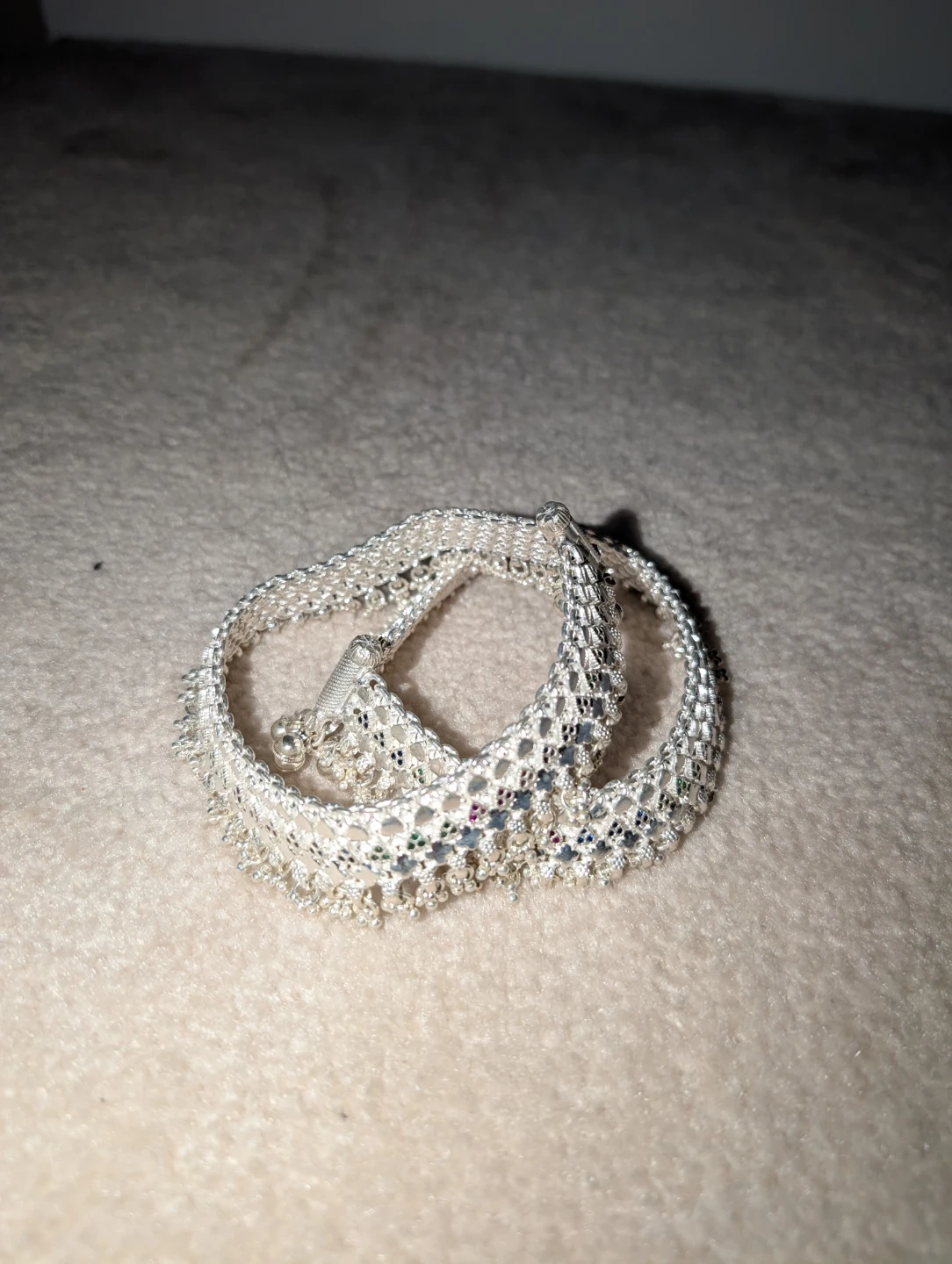 Handcrafted traditional Rajasthani Banjara silver anklets with intricate detailing and multicolour stone work. These pieces are 100% authentic and made with high-quality craftsmanship, perfect for collectors, weddings, cultural events, or anyone who loves unique heritage jewellery.