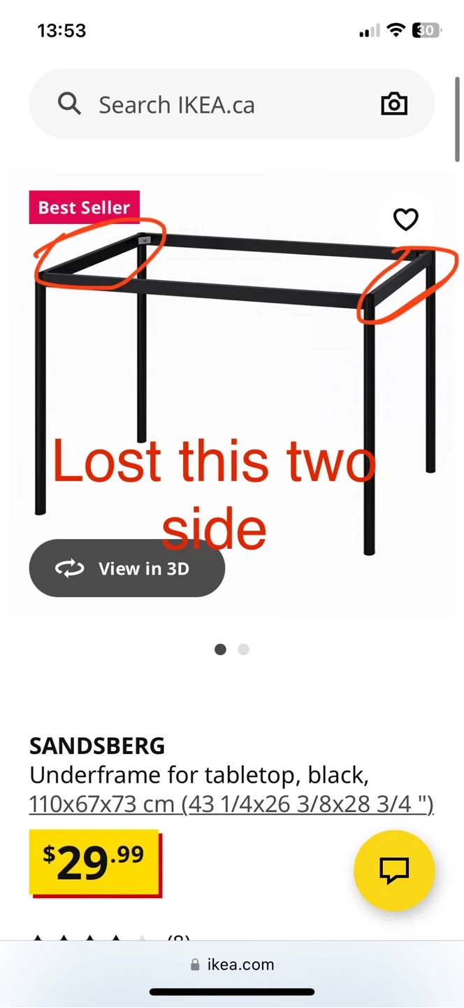 Missing the two side support bars, so the buyer will need to request the free replacement parts from IKEA (they provide missing parts for free if you give them the product label).
