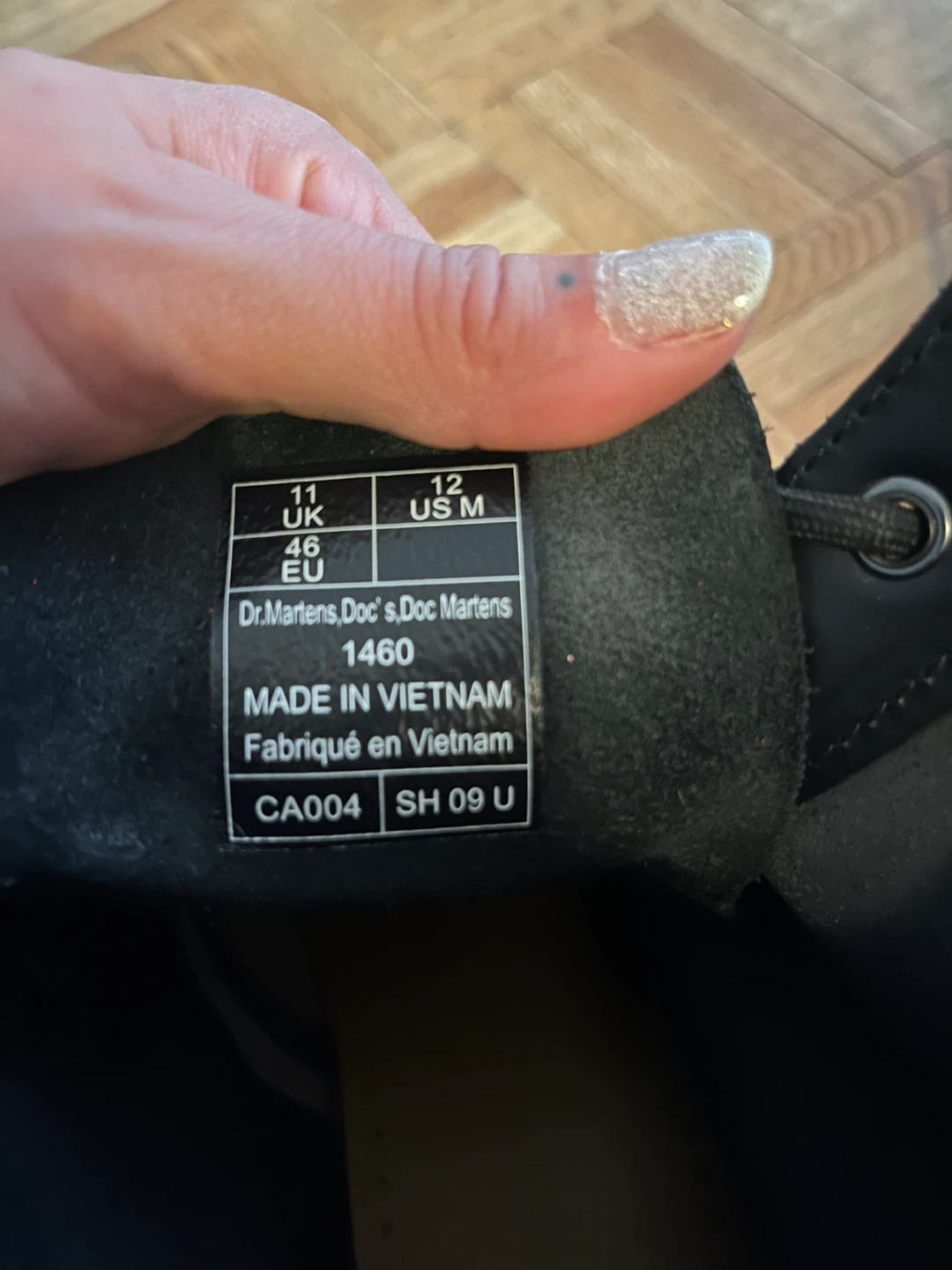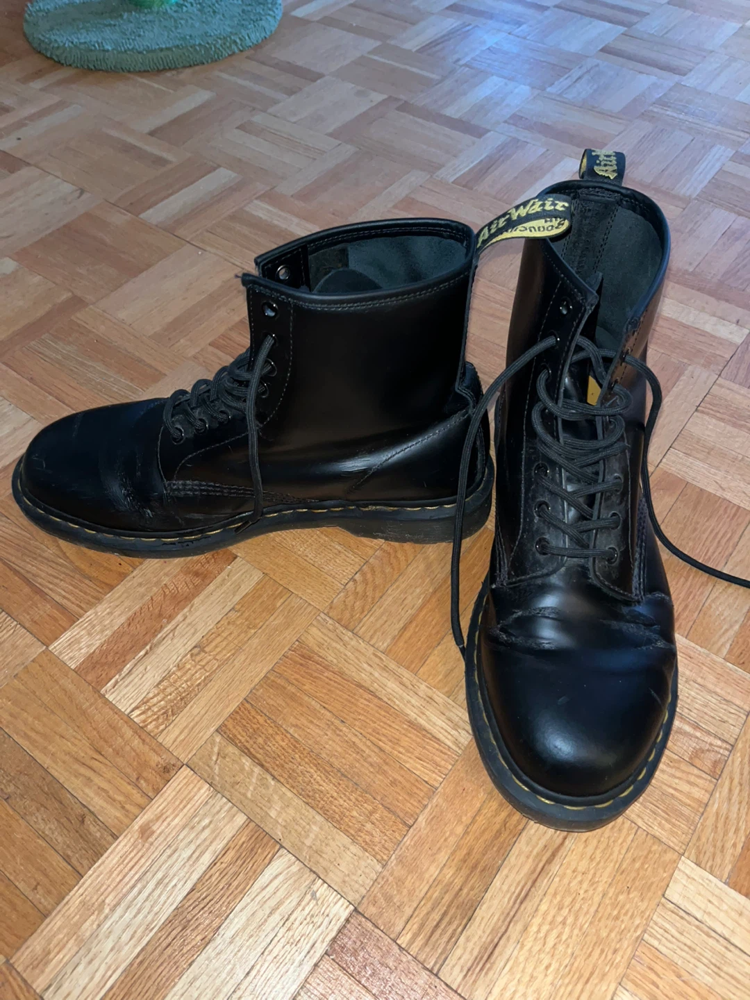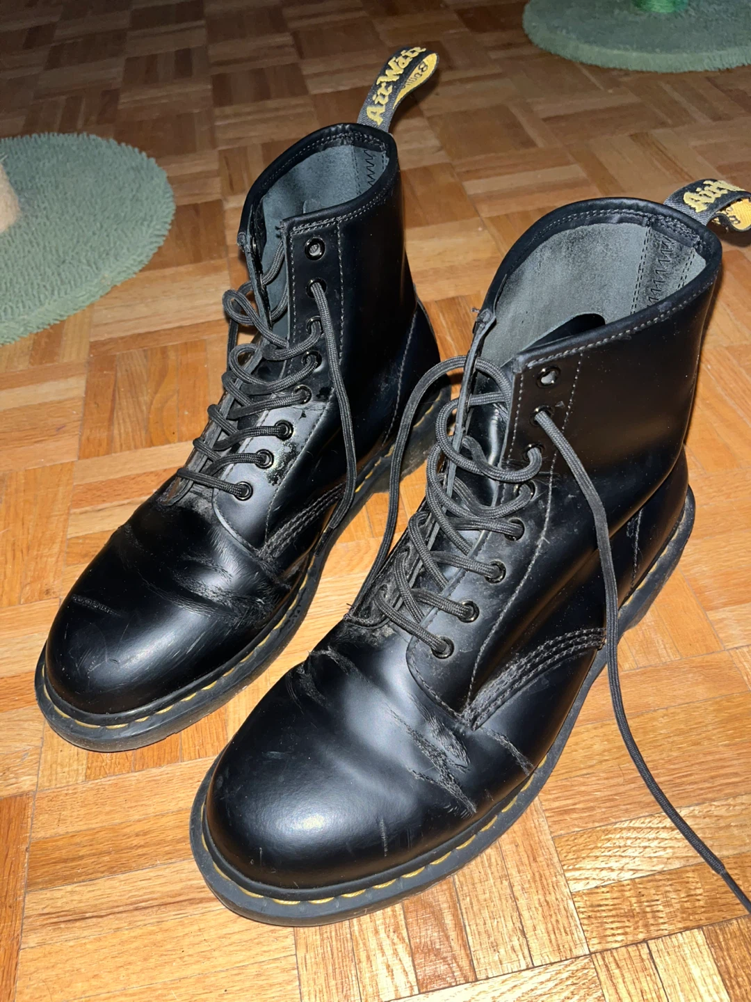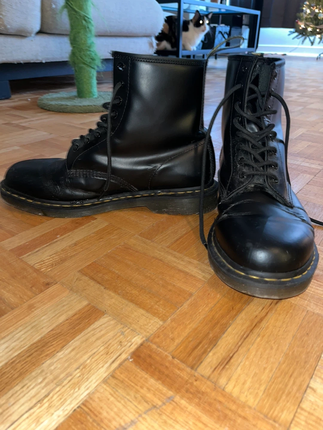 Selling a pair of Dr. Martens 1460 boots in black leather. They have some visible scratches and wear, as shown in the photos. Still lots of life left in them!