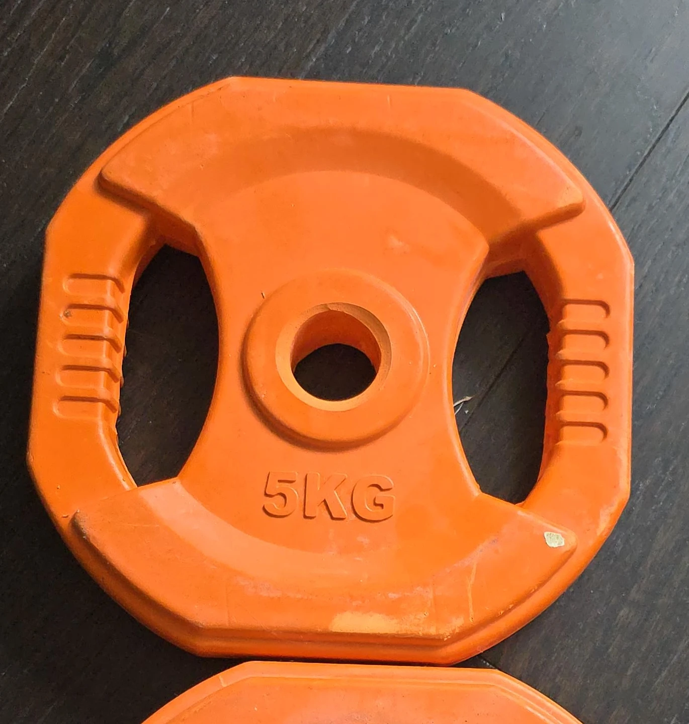 Selling an orange a paire weight plate, it weighs 5KG. It's in used condition, please see pictures for details