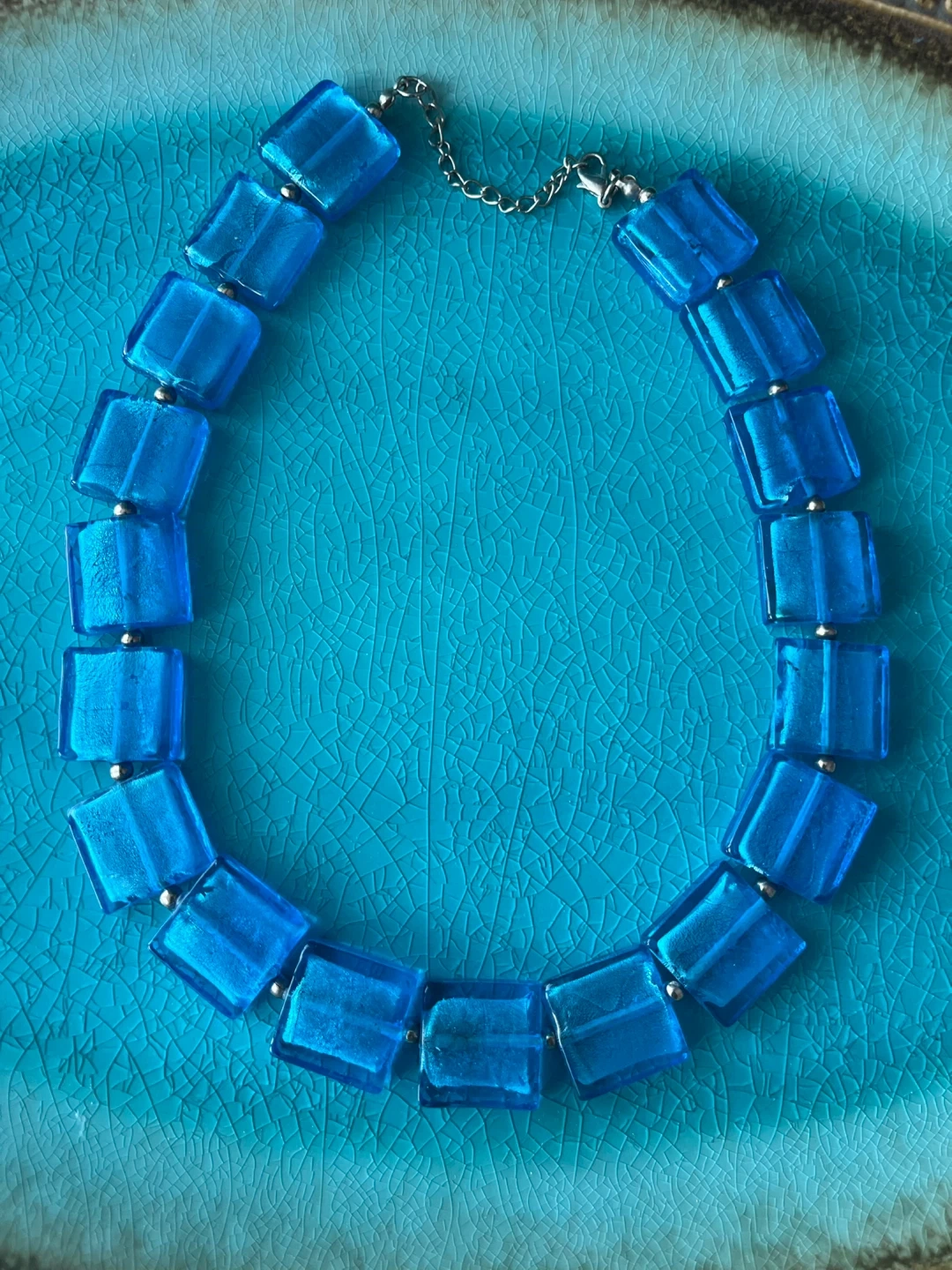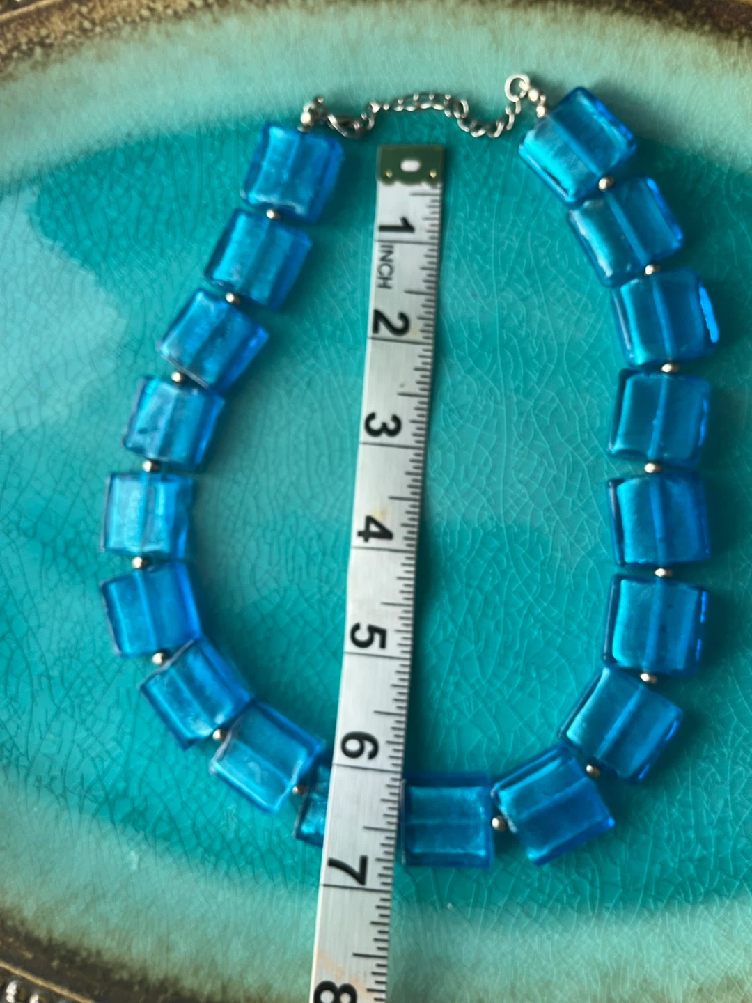 Here's a lovely blue beaded necklace! It measures approximately 17 inches in length.