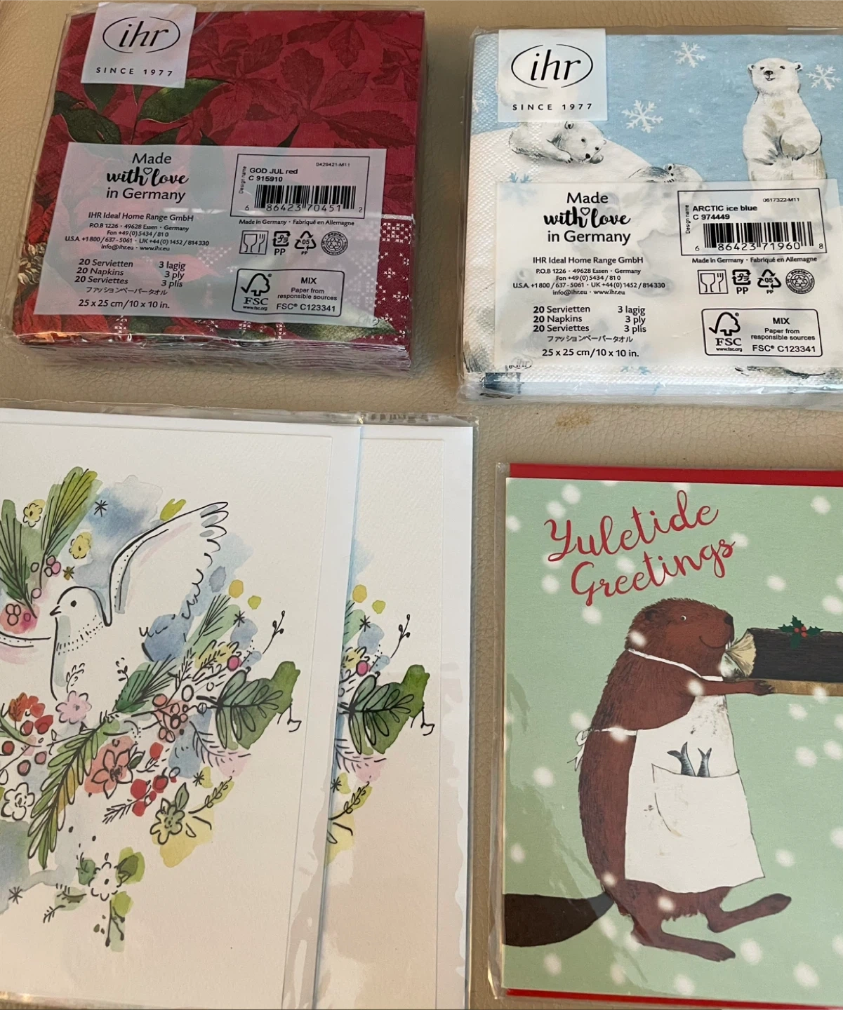 Selling 2 packs of NEW Christmas-themed napkins. And 5 NEW cards from IHR! The napkins come in a variety of festive designs, including polar bears and poinsettias. The cards feature adorable illustrations with holiday greetings like 'Meowy Christmas' and 'Yuletide Greetings'. Perfect for adding a touch of holiday cheer to your gatherings!