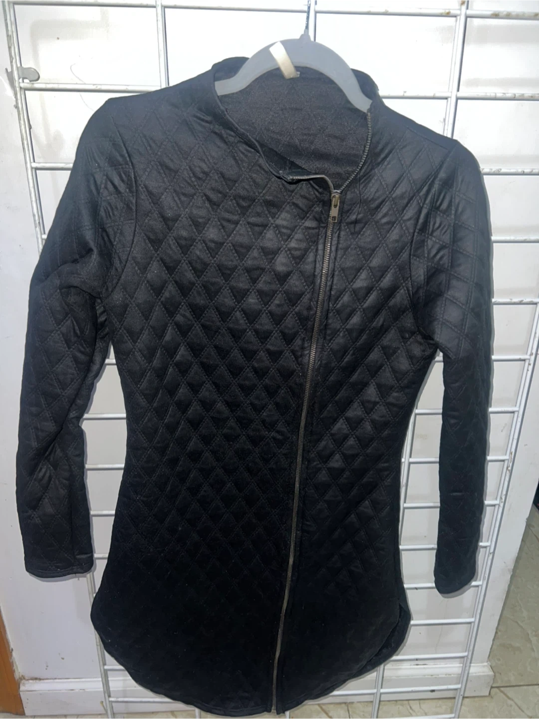 A stylish black quilted jacket is up for grabs! It features an asymmetrical zipper and a unique design. Perfect for adding a touch of edgy flair to your wardrobe