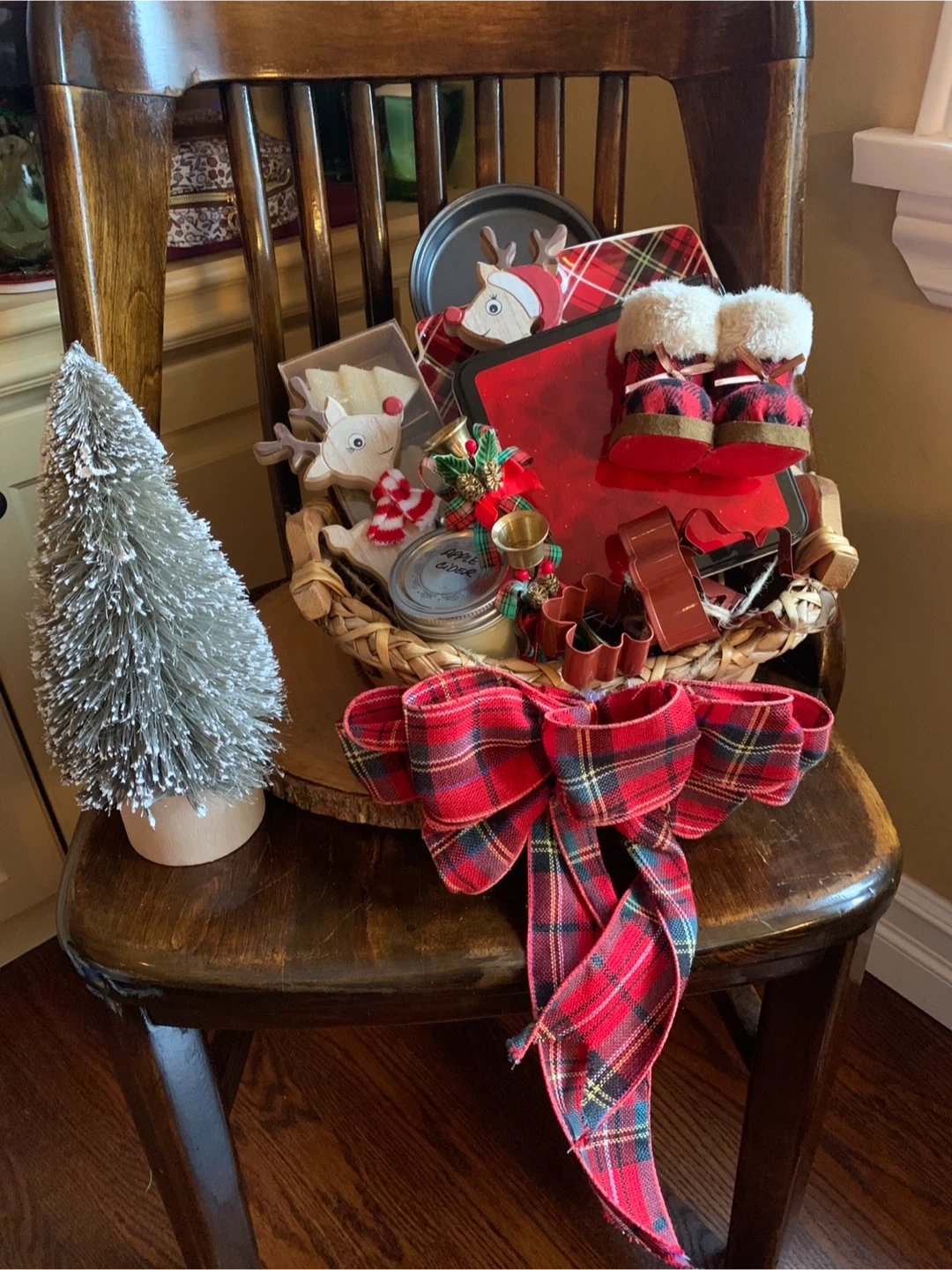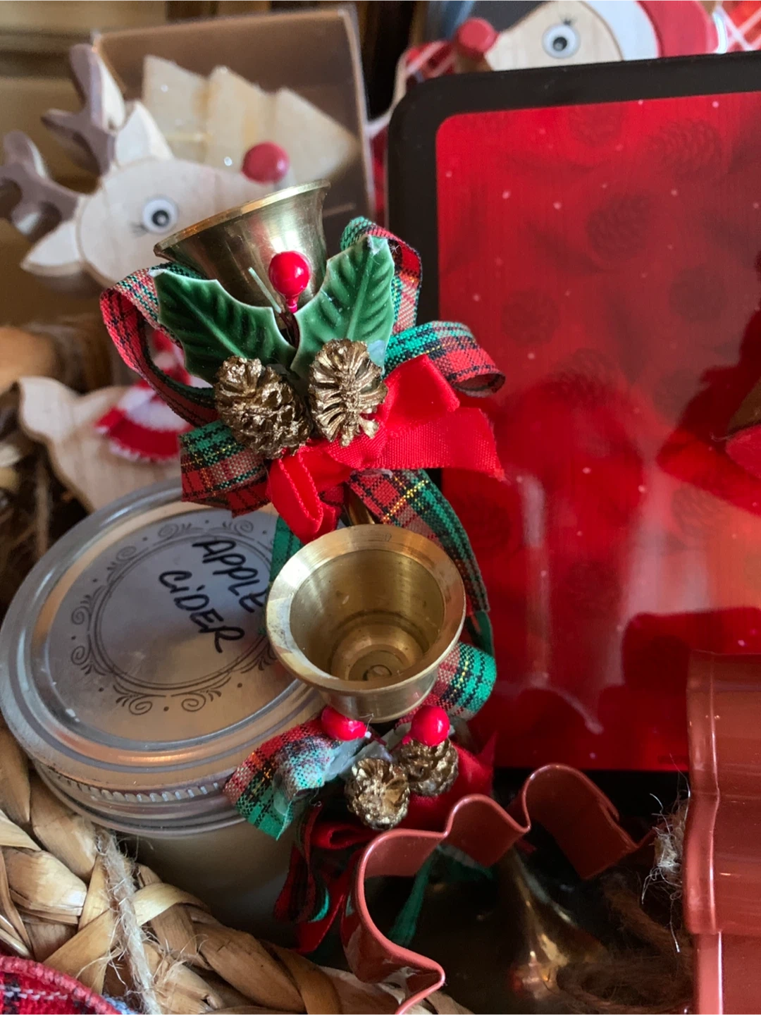 Here’s a basket filled with festive thrifted Christmas decor! Includes cute plaid ornament boots, tree-shaped candles, reindeer wooden decorations, metal cookie cutters, two brass candlestick holders, Wilson gingerbread cookie sheet, plaid tin, and a plaid tree shaped ceramic cookie plate all displayed in a great reusable basket! Items are in new-like condition, candles are unused. Perfect for adding some holiday cheer to your home or a gift for someone!