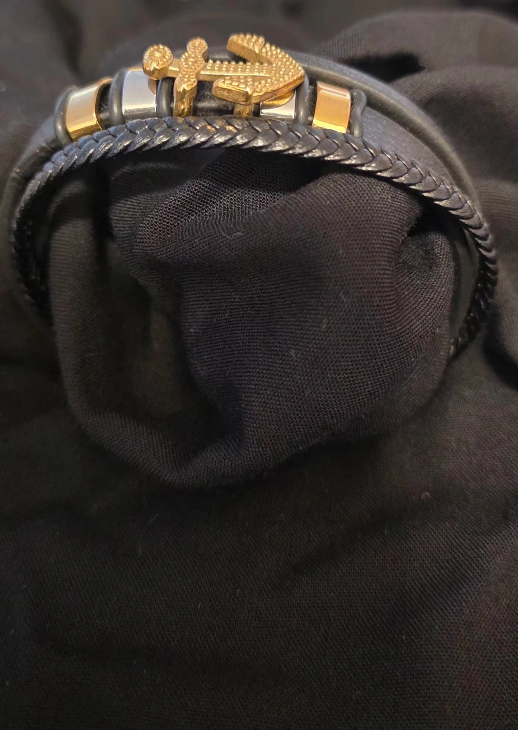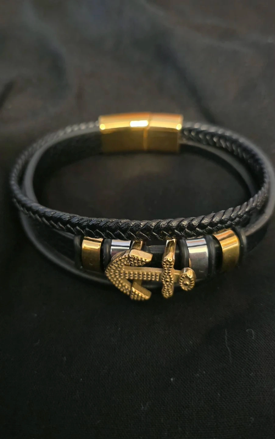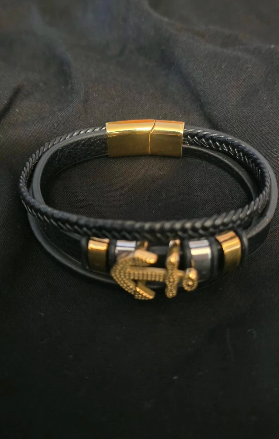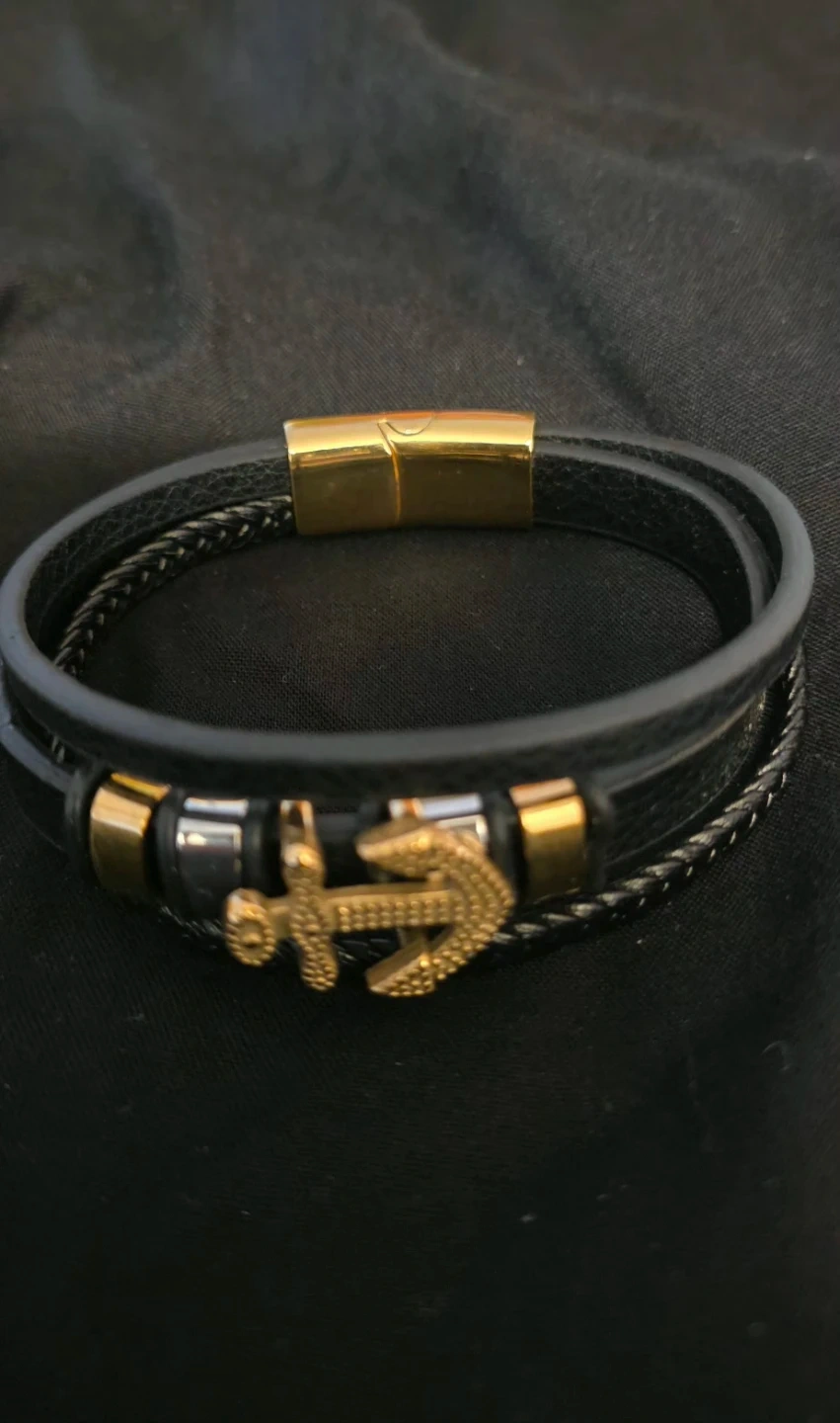 Stylish black leather bracelet featuring a gold-colored anchor charm. ready to add a touch of nautical flair to your look!