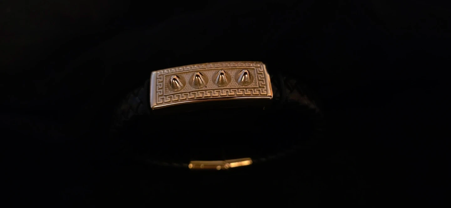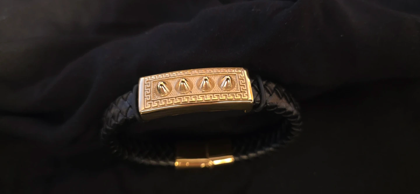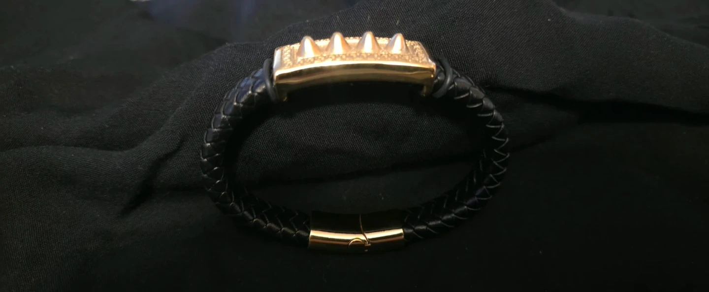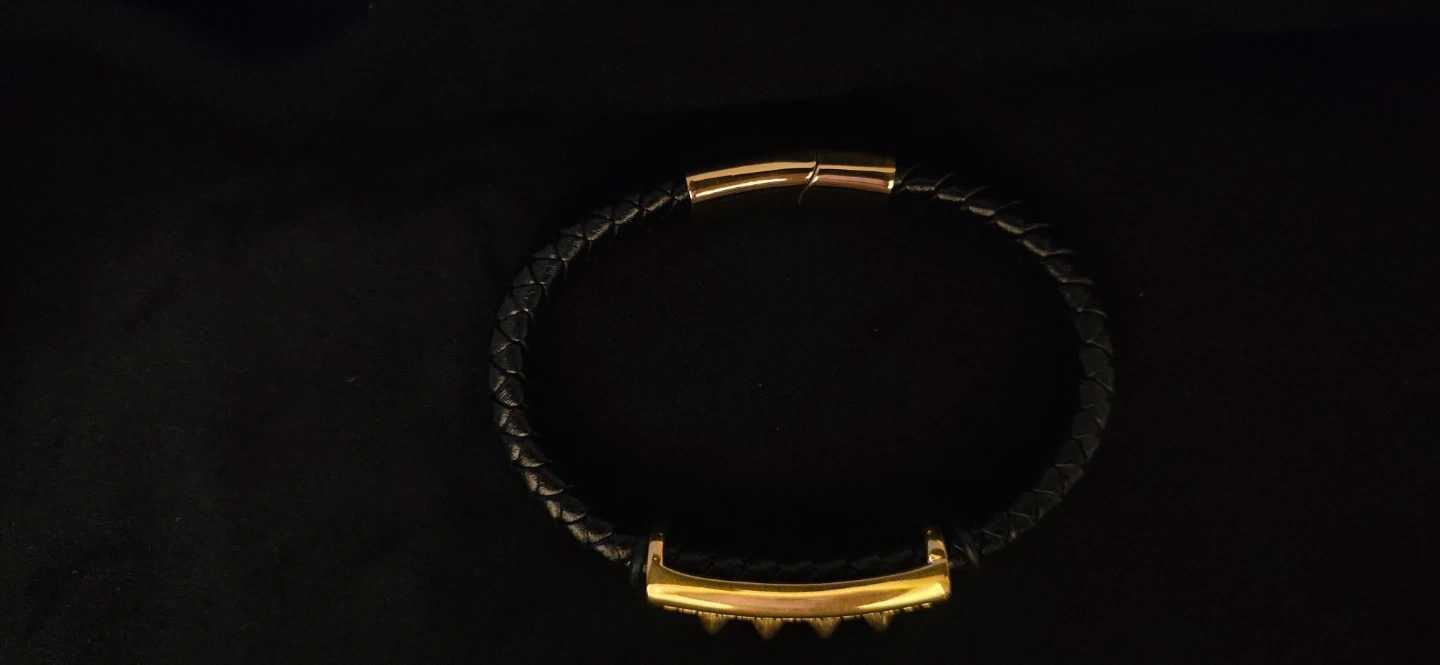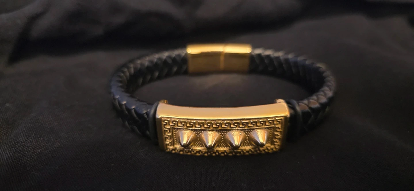 Selling a stylish braided leather bracelet featuring a unique gold-colored accent piece. The bracelet has a magnetic clasp for easy wear.