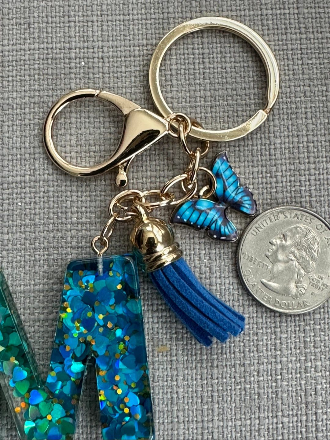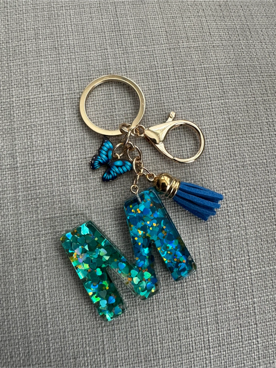 Check out this cute handmade initial 'M' keychain! It features a mix of blue and green glitter inside the resin letter, along with a blue butterfly charm and a matching tassel. It's perfect for adding a personal touch to your keys or bag!