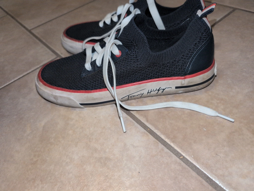Selling a pair of Tommy Hilfiger sneakers in black. They have some signs of wear but are still in good condition! just need to be washed