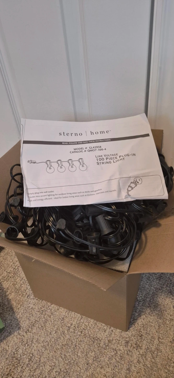 Selling a brand new set of Sterno Home outdoor string lights! These are the GL42958 model, featuring incandescent clear globe G40 bulbs with a black rubberized cord. The total length is 100ft and they have 100 sockets. Also included are 100 bulbs plus 2 spares. Perfect for adding a warm glow to your deck, garden, or gazebo! Indoor use also.