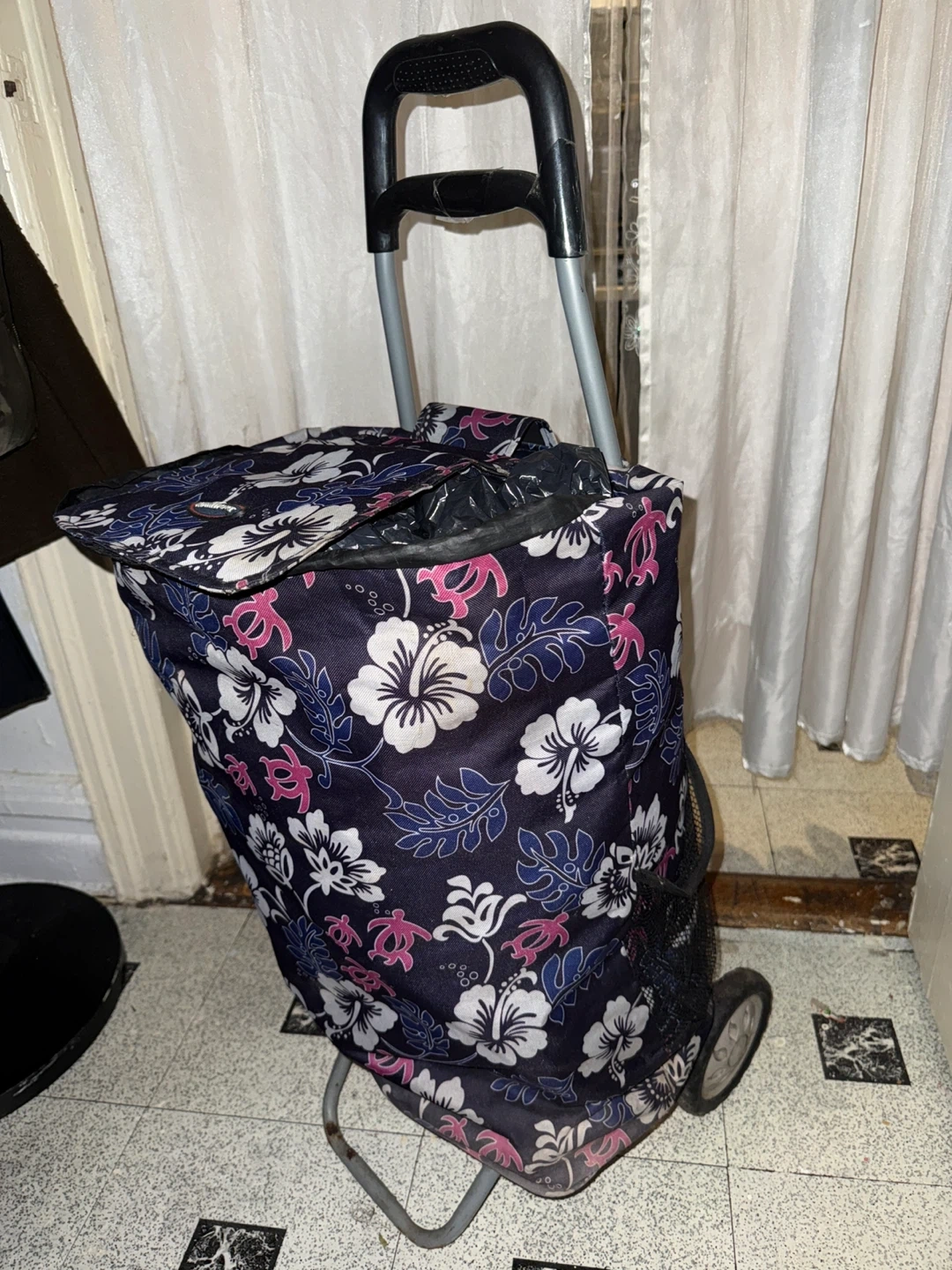 This is a shopping cart with a fun floral pattern. It's perfect for carrying groceries or other items. It has wheels for easy transport. Condition:OKAY. Smoke free home.