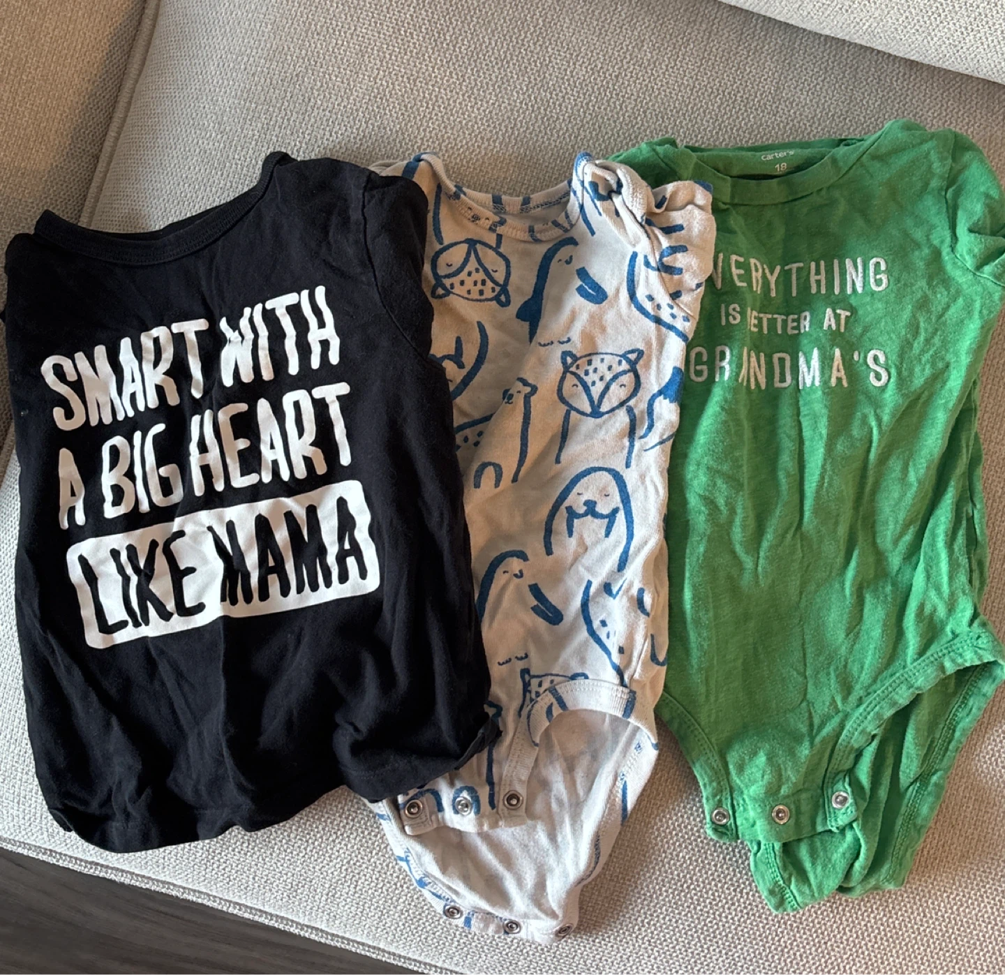 Selling a set of three Carter's baby bodysuits in size 18 months. One is black with the text "SMART WITH A BIG HEART LIKE MAMA", another is white with blue animal drawings, and the third is green with the text "EVERYTHING IS BETTER AT GRANDMA'S". They're in great condition!