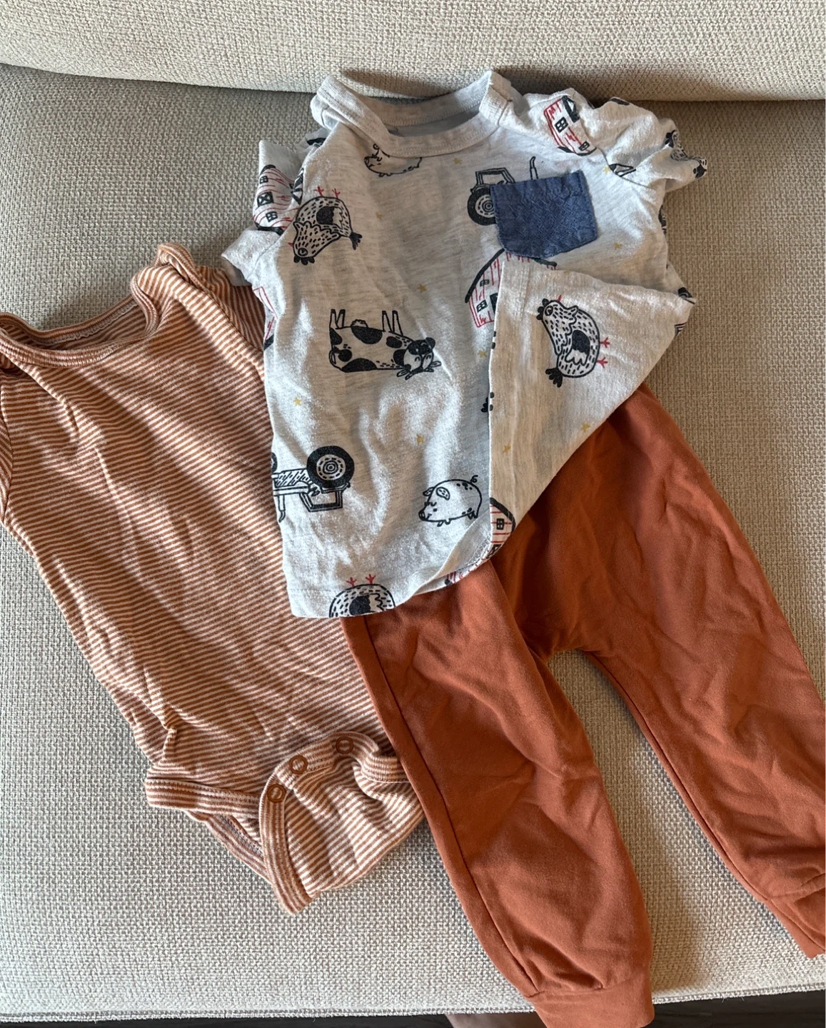 Here's a cute little set of baby clothes! Includes a striped bodysuit, a patterned shirt with farm animals, and a pair of solid brown pants. Perfect for your little one!