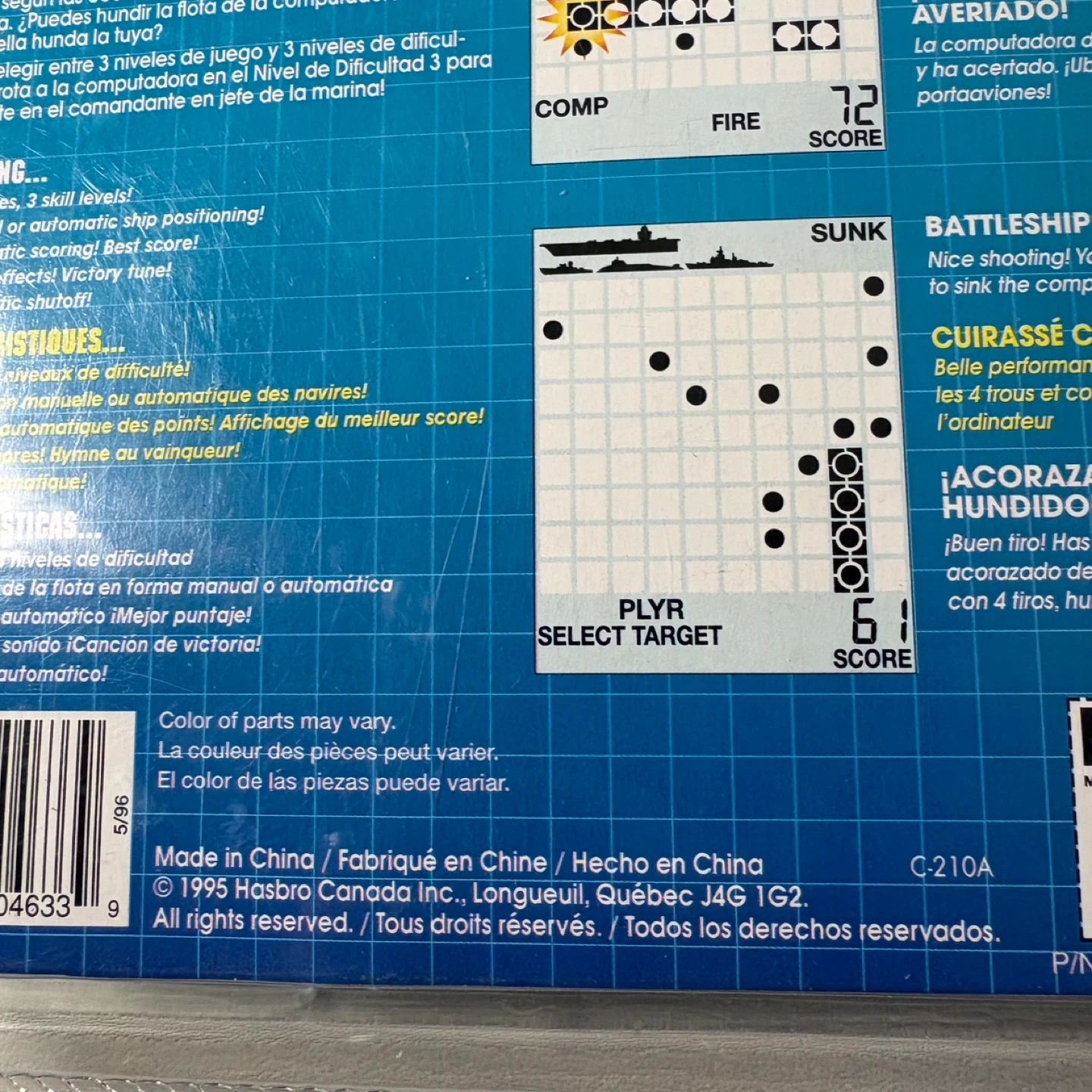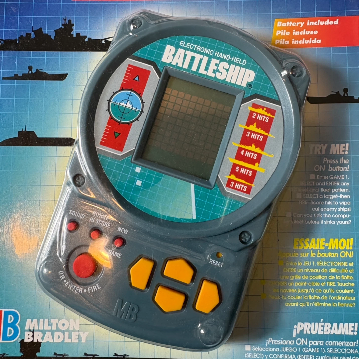 Battleship - the classic naval combat game. Electronic hand held. 3 games, 3 skill levels. Age 7+.