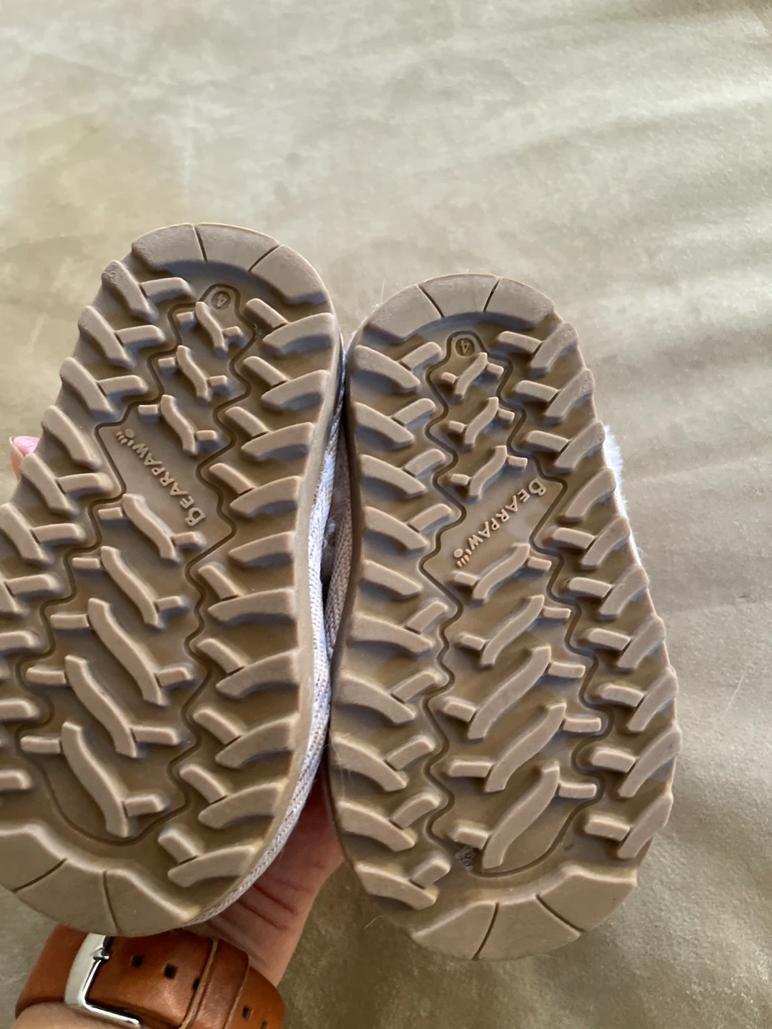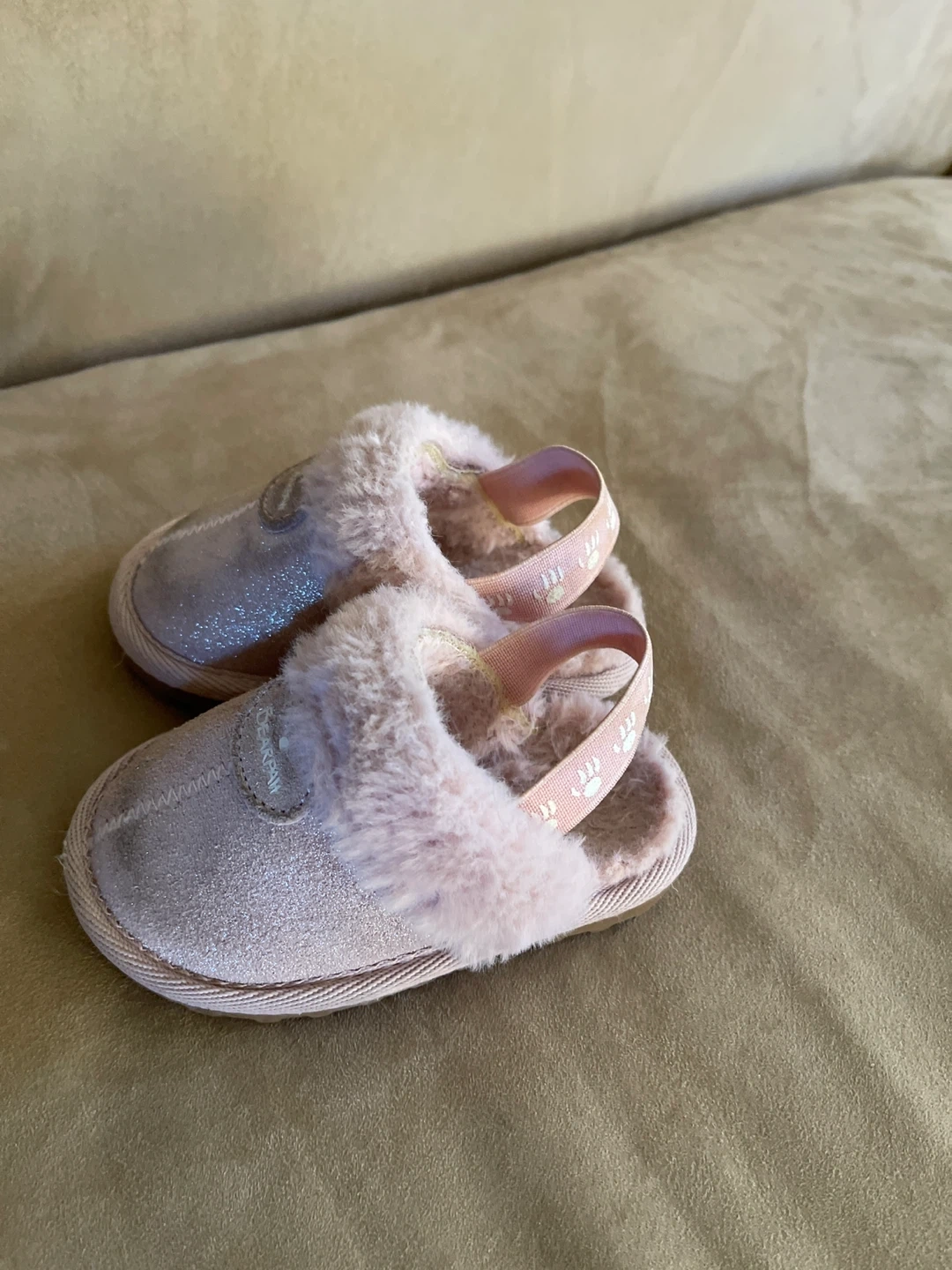 These adorable Bearpaw slippers are perfect for keeping little feet cozy! They feature a soft, pink faux fur trim and a convenient back strap. Size 4