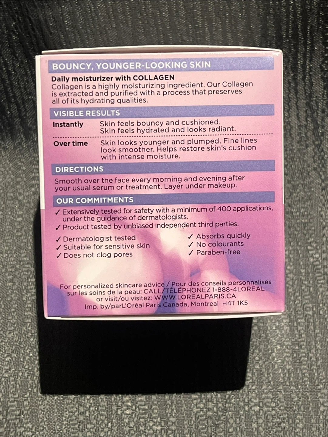 I'm selling a L'Oréal Paris Collagen Moisture Filler Daily Moisturizer! This new formula visibly smooths fine lines and restores skin's cushion. It leaves skin feeling bouncy, cushioned, hydrated, and radiant. It's suitable for sensitive skin, doesn't clog pores, and is paraben-free