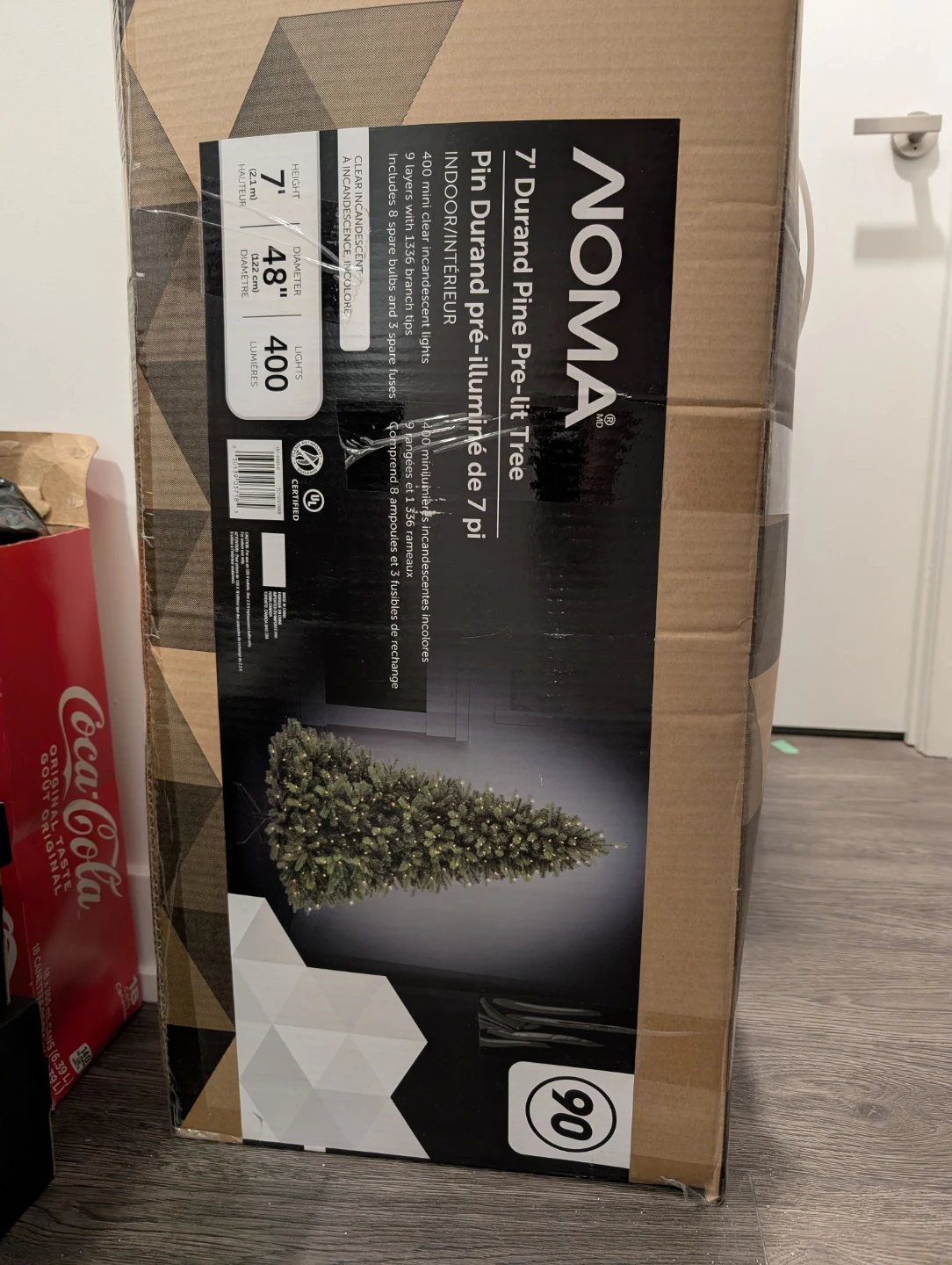 Selling a NOMA 7' Durand pre-lit Christmas tree. The tree is 7 feet tall and has a 48-inch diameter. Includes 400 lights and 1335 branch tips. Comes with the original box. Used for one holiday.
