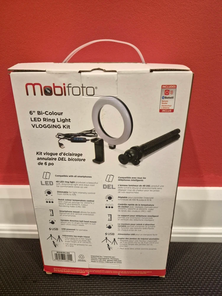 Selling a Mobifoto 6" Bi-Colour LED Ring Light Vlogging Kit! It's compatible with all smartphones and has 48 LED ring lights for comfortable close-up use. The kit includes a remote for smartphones and an adjustable leg angle tripod. It also features quick colour temperature control and variable direction both head mount. This is brand new in the box and ready to gift for Christmas!