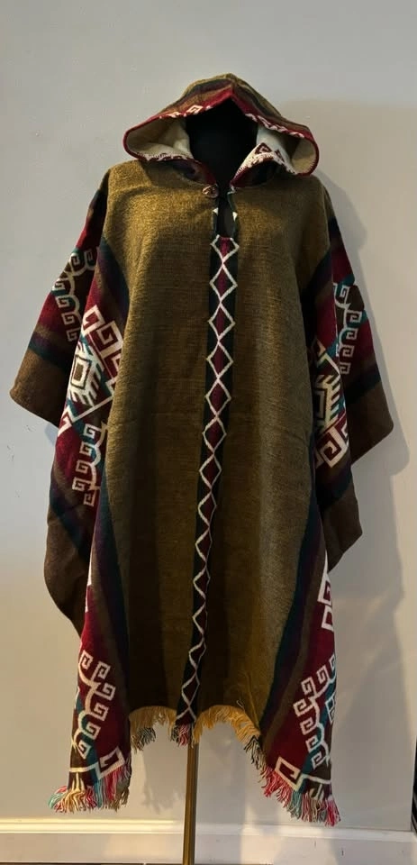 Wrap yourself in tradition and artistry with this unique poncho, made in Ecuador. Woven from a soft blend of wood and cotton, it offers both warmth and breathability, making it perfect for fall, winter and spring. Its vibrant, colorful designs reflect the rich cultural heritage of the Andes, each pattern telling a story of craftsmanship passed down through generations. Lightweight yet cozy, this poncho is as versatile as it is striking - ideal for everyday wear, travel, or as a statement piece that celebrates authentic Ecuadorian artistry. DIMENSIONS: *3'6" WIDE *3'11" LONG