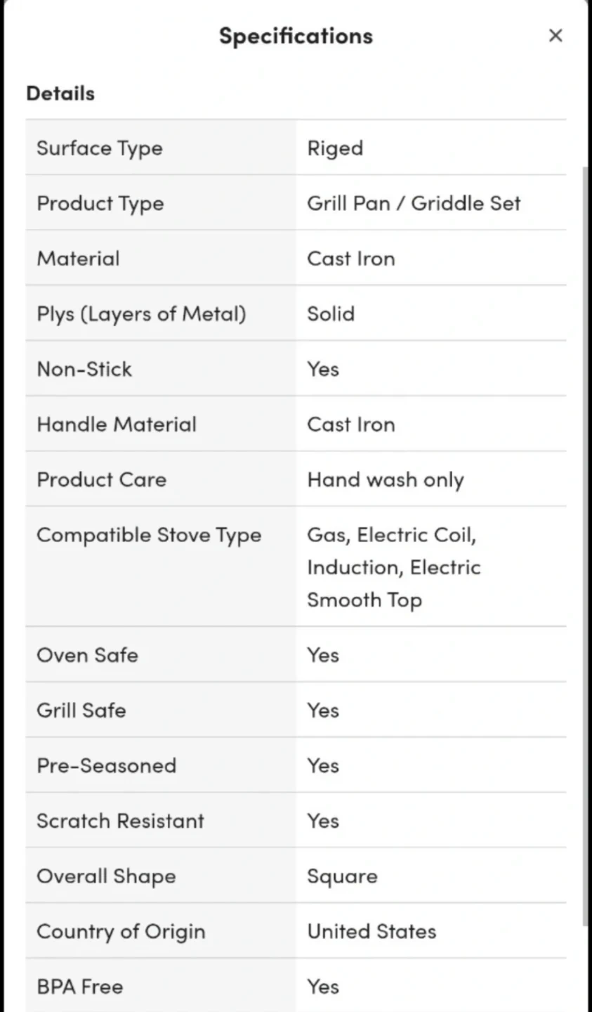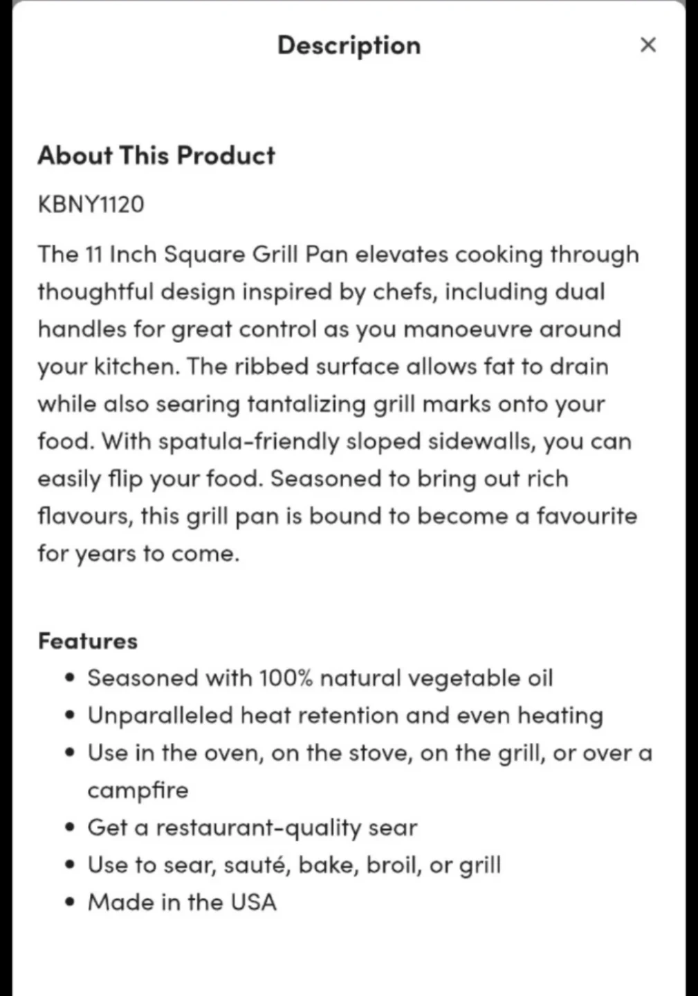 I'm selling a Lodge Chef Collection 11 Inch Square Grill Pan. It's made of cast iron and is pre-seasoned. It's compatible with gas, electric coil, induction, and electric smooth top stoves. It's also oven and grill safe. The ribbed surface allows fat to drain while also searing tantalizing grill marks onto your food. It's seasoned with 100% natural vegetable oil and made in the USA.