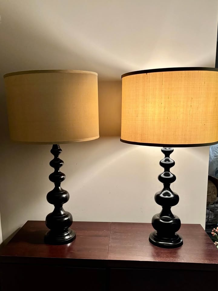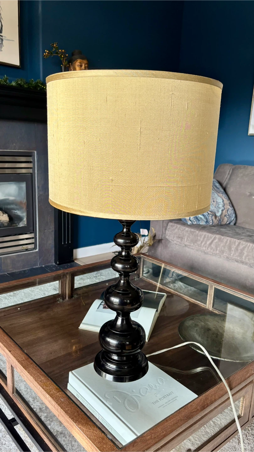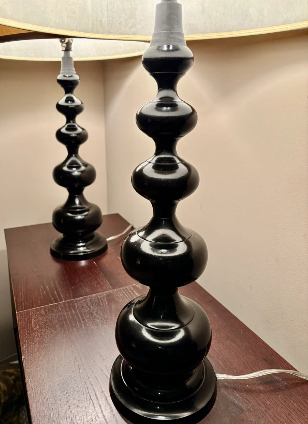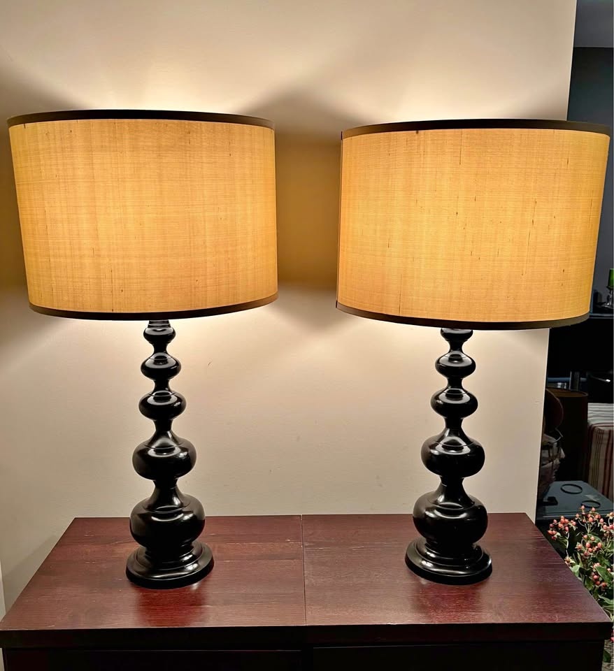 Two funky, sculptural table lamps with a black base and chartreuse linen shade. Total height of lamp (from finial to bottom of base) is 31”, the shade is 17” in diameter and 11” high. $125 for BOTH, each would have retailed for at least $225 a piece. Tri light bulbs are included.