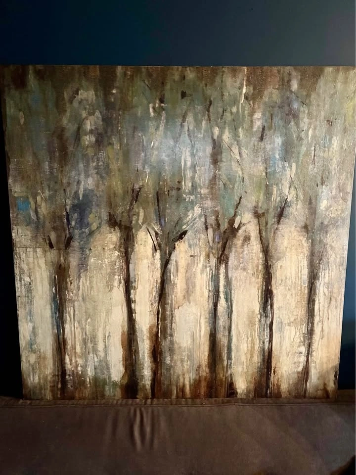 Square 47” x 47” print of ethereal, abstract trees. Colour palette is complementary to any room. One wire attachment on the back; fairly lightweight.