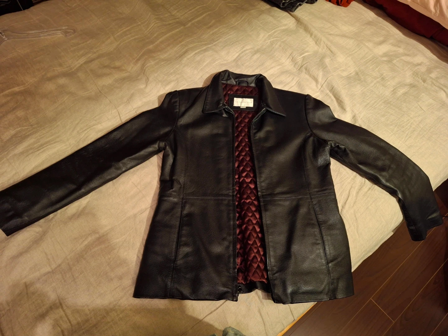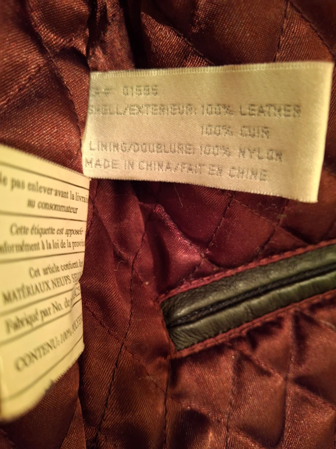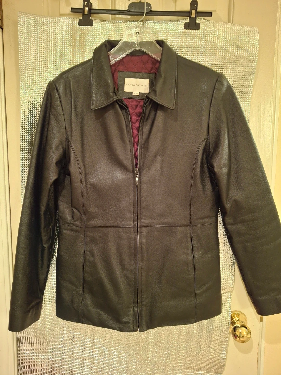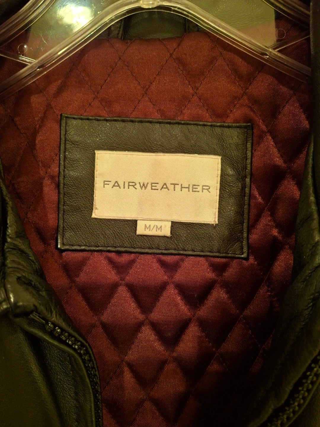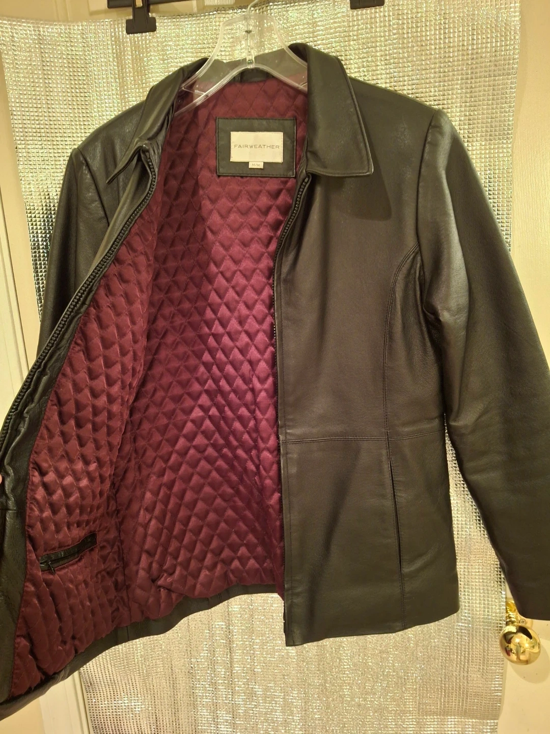 Selling a Vintage Fairweather black leather jacket in size M. It's a stylish jacket made of 100% leather for the shell and 100% nylon quilted Burgandy color for the lining. It's in good condition and ready for a new owner!