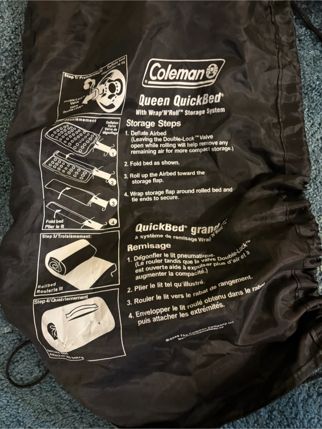 Selling a Coleman Queen QuickBed Elite Extra High Airbed! It comes with a Wrap'N'Roll Storage System. It's in good condition and ready for a new home. Size: Queen