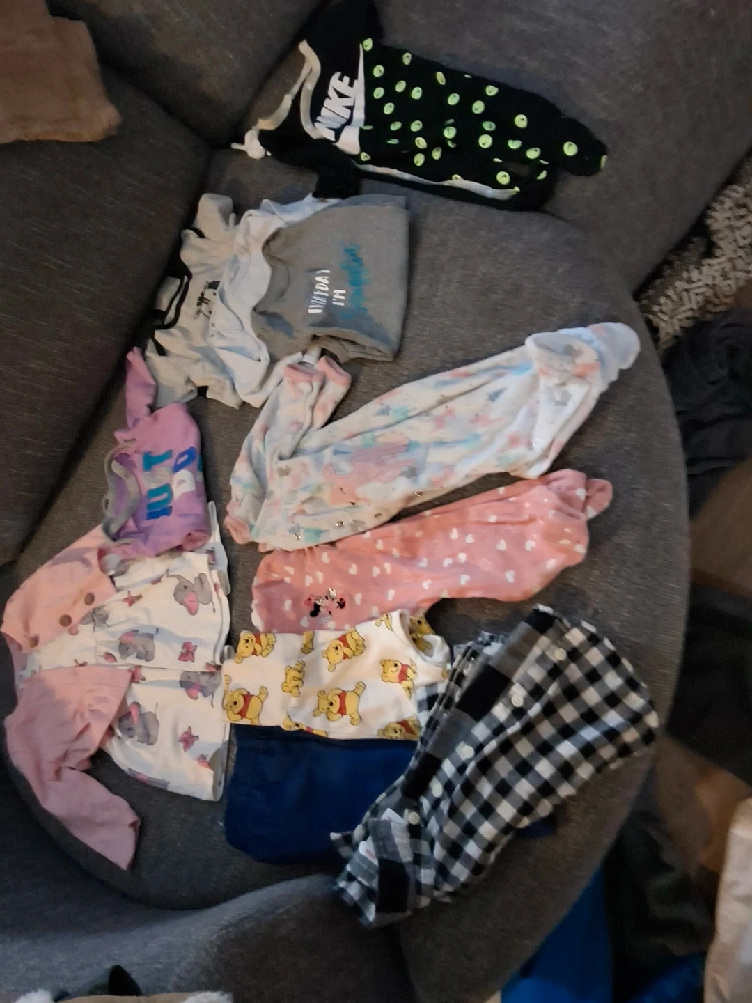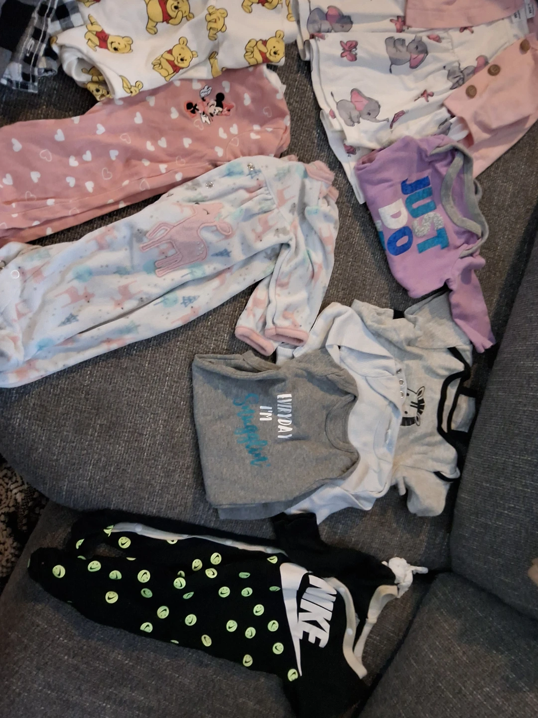 Selling a bundle of baby clothes, size 3-6 months. Includes a mix of onesies, shirts, pants, and a cute dress with a cardigan. All in good condition!