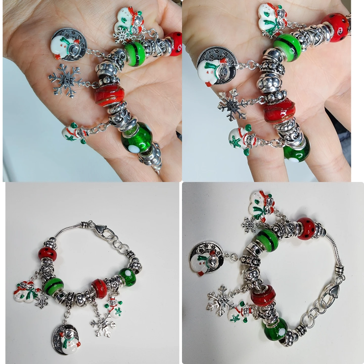 Here's a festive Christmas-themed charm bracelet! It features red and green beads, along with adorable snowman and snowflake charms. Perfect for adding a touch of holiday cheer to any outfit