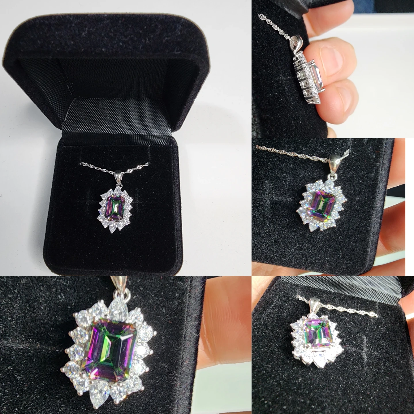 Beautiful sterling silver necklace featuring a mystic topaz stone surrounded by cubic zirconia. Comes in a black velvet box, perfect for gifting or keeping it safe. The stone has a lovely rainbow effect. It's in great condition!