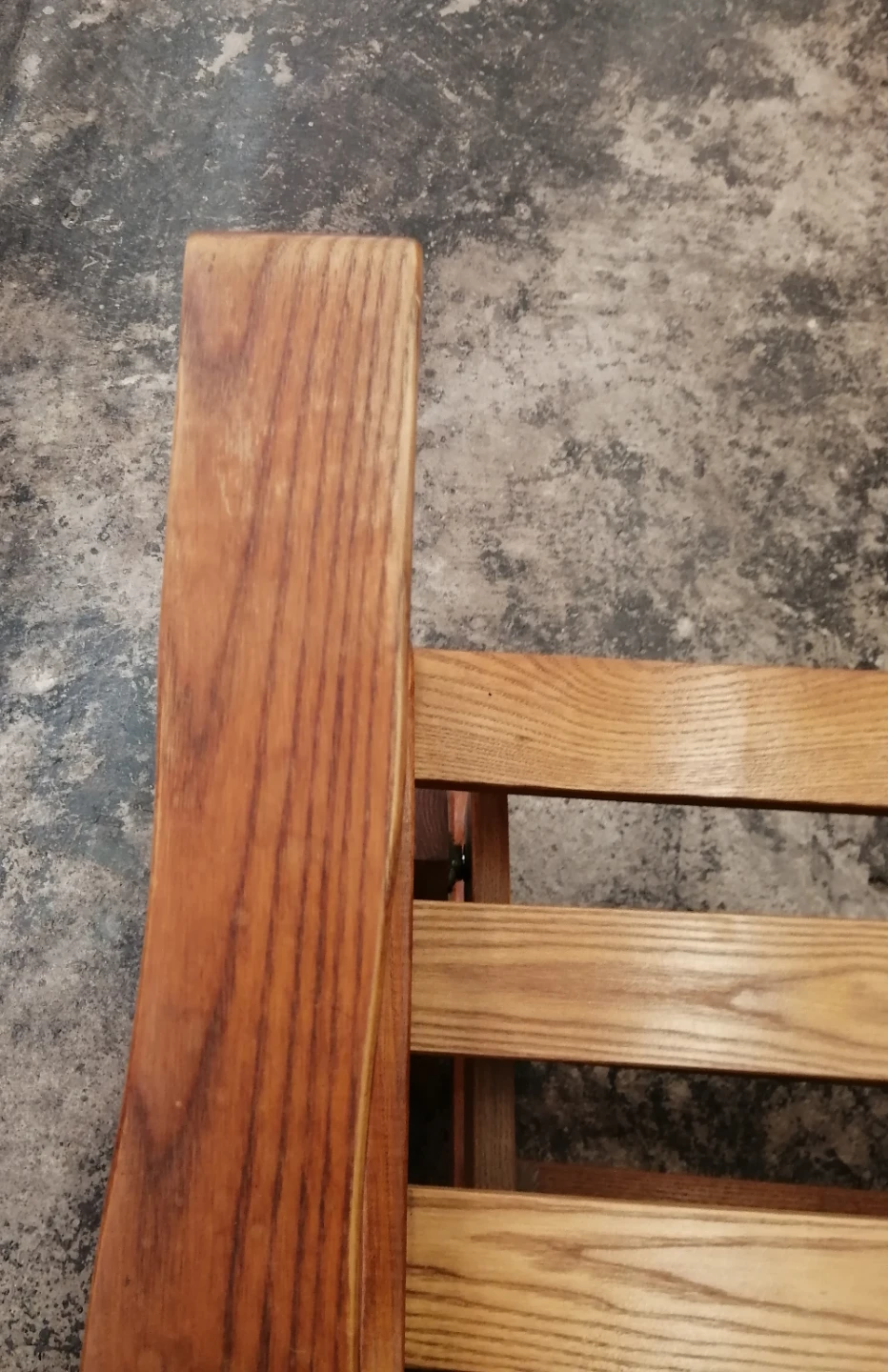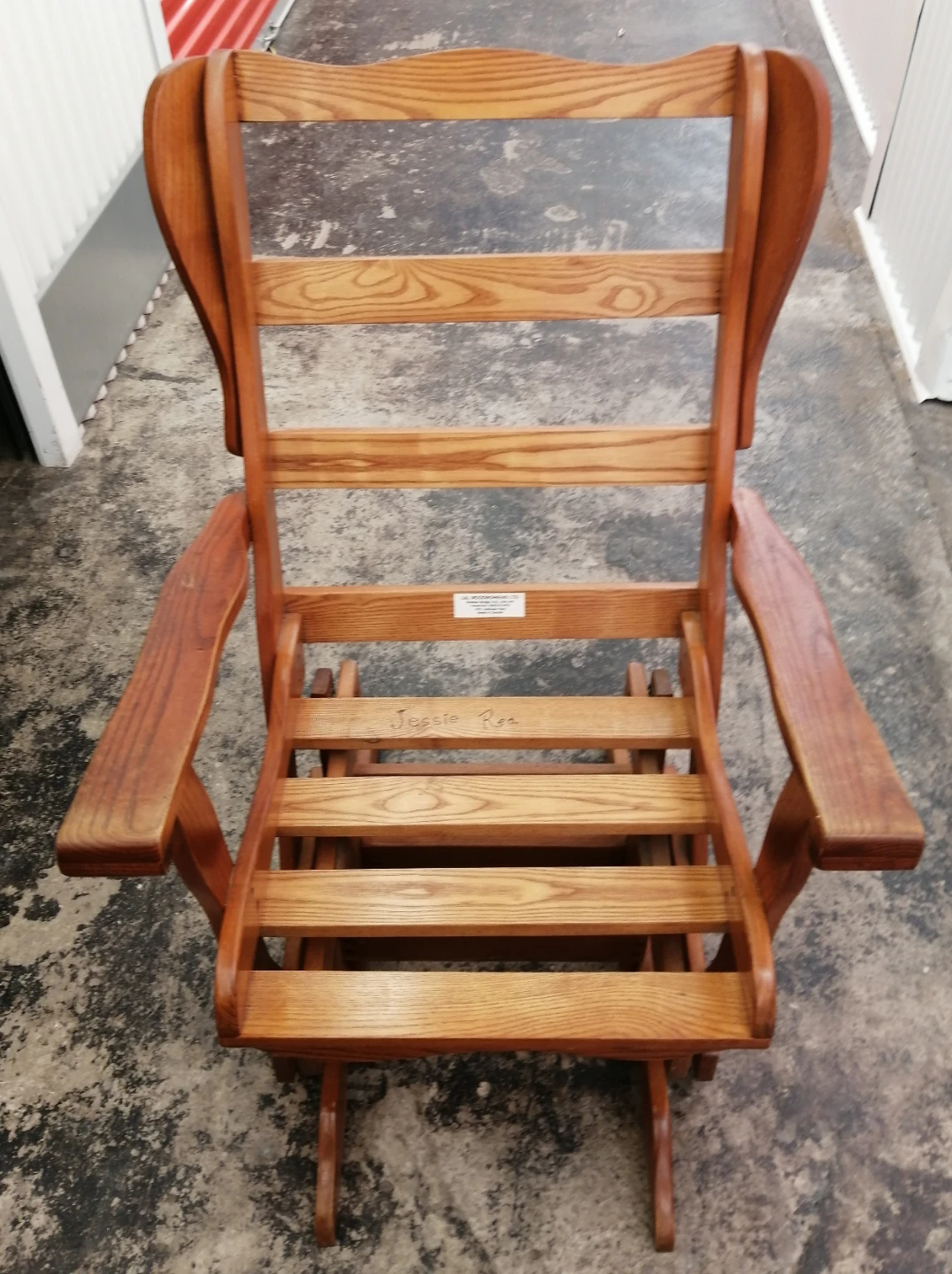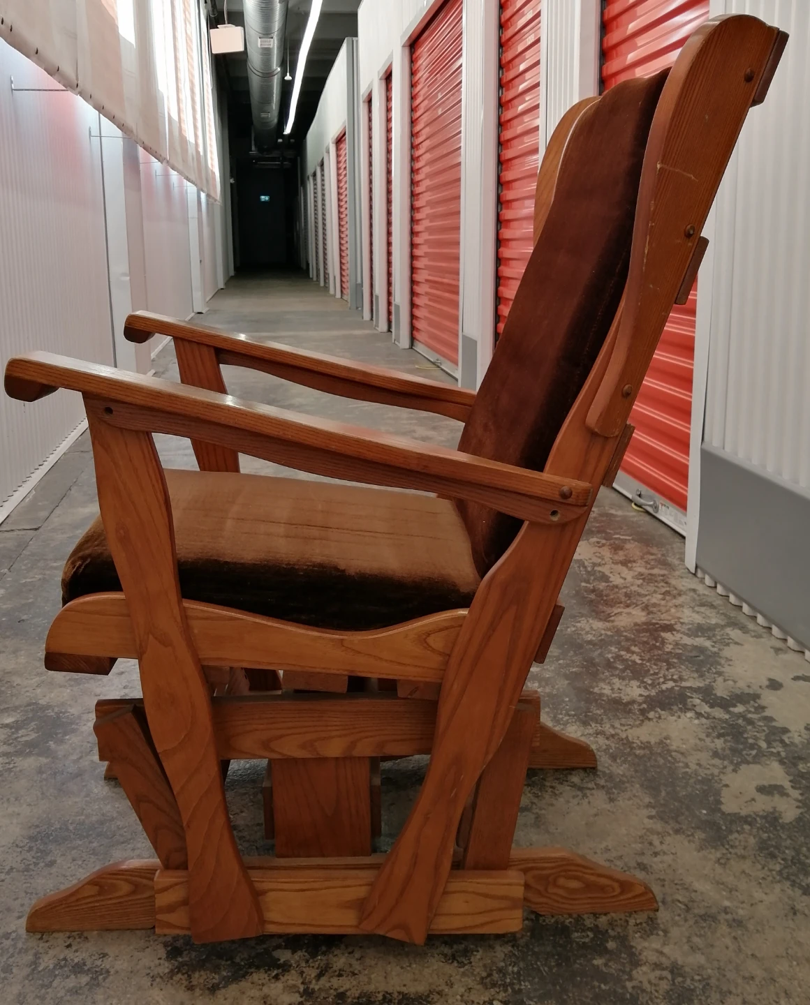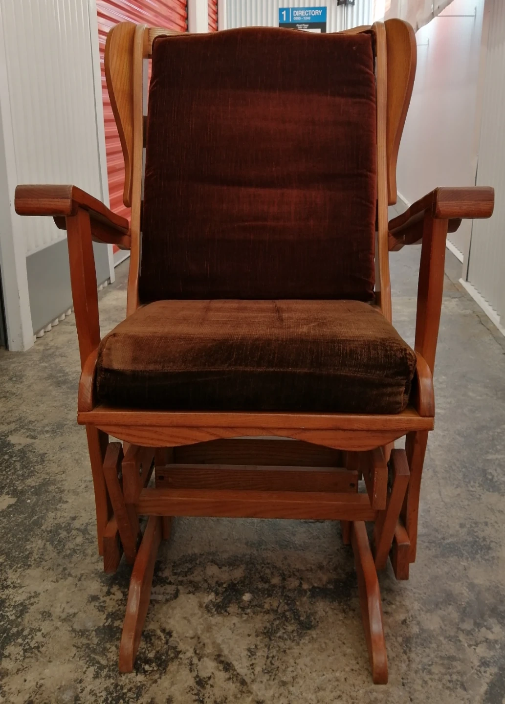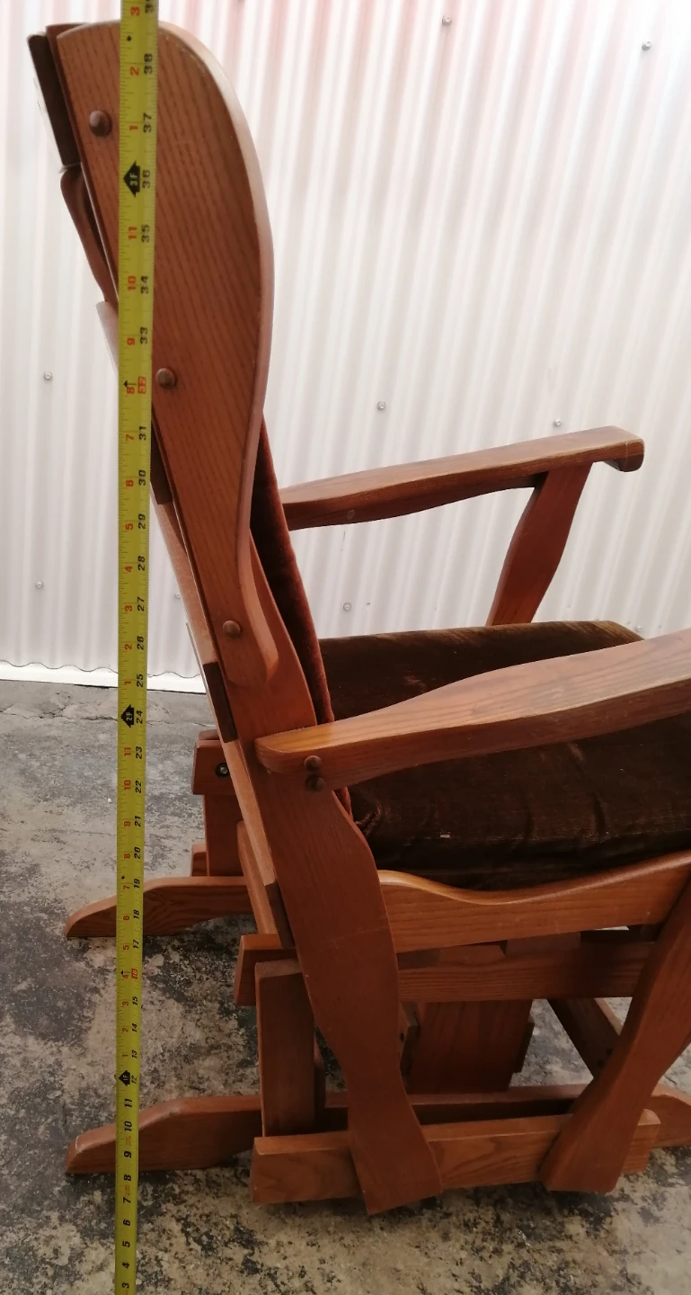 Here's a comfy wooden glider rocking chair with a cushion! It looks great and is perfect for relaxing. The chair is in good condition and ready for a new home.