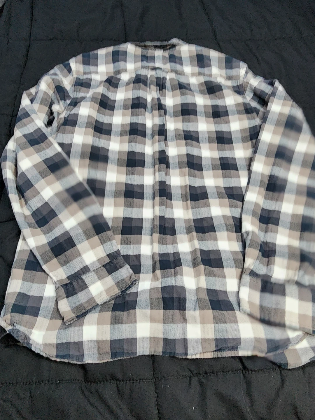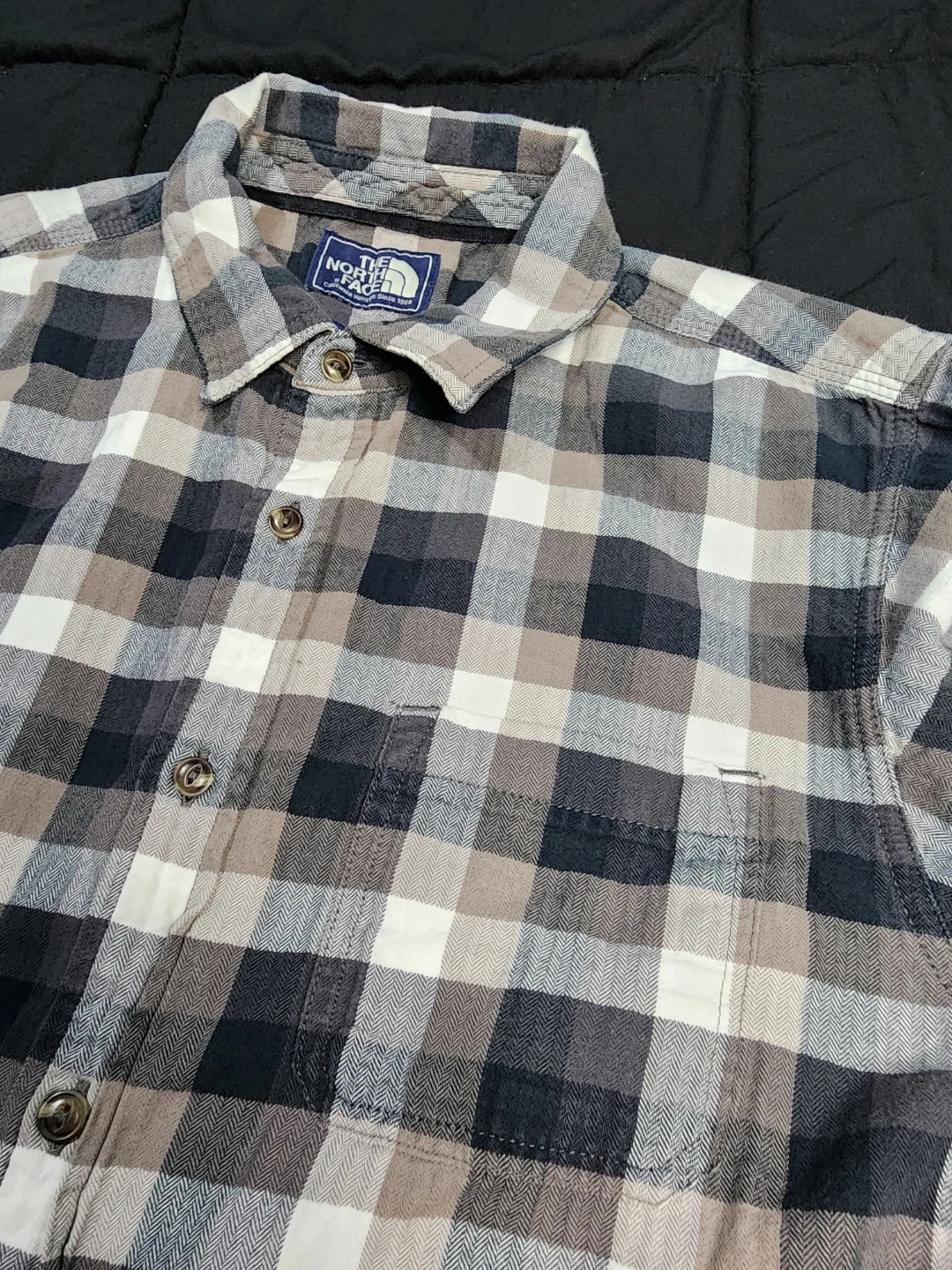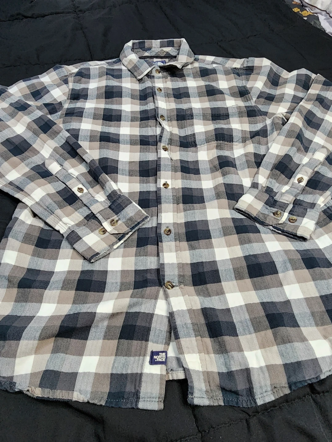 The North Face flannel shirt. It features a classic plaid pattern in shades of gray, black, and white. The shirt is a size medium and made in India. Perfect for layering or wearing on its own!