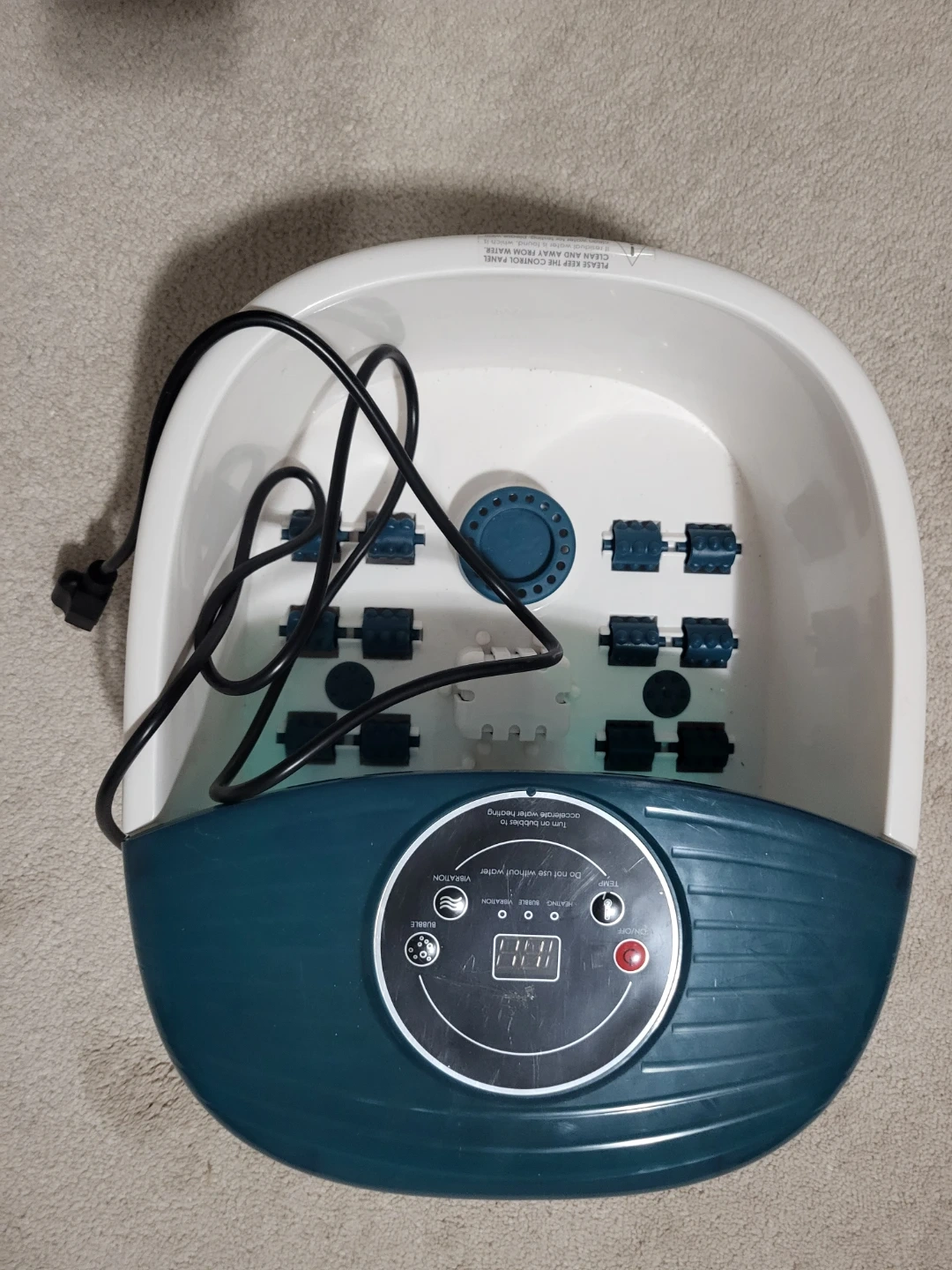 This foot spa is perfect for relaxing after a long day! It features massage rollers to soothe your tired feet. It's in great condition and ready to use for your next at-home spa day