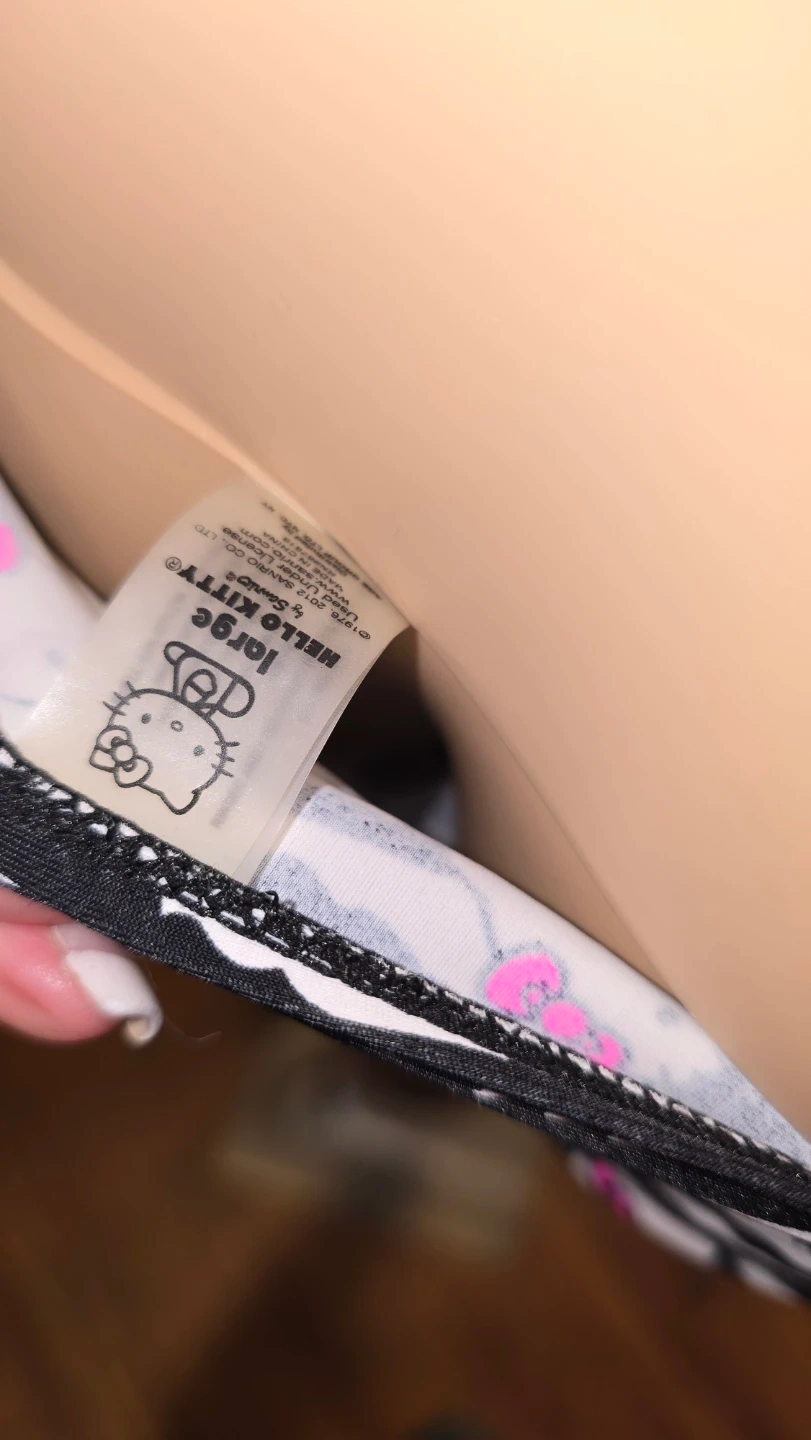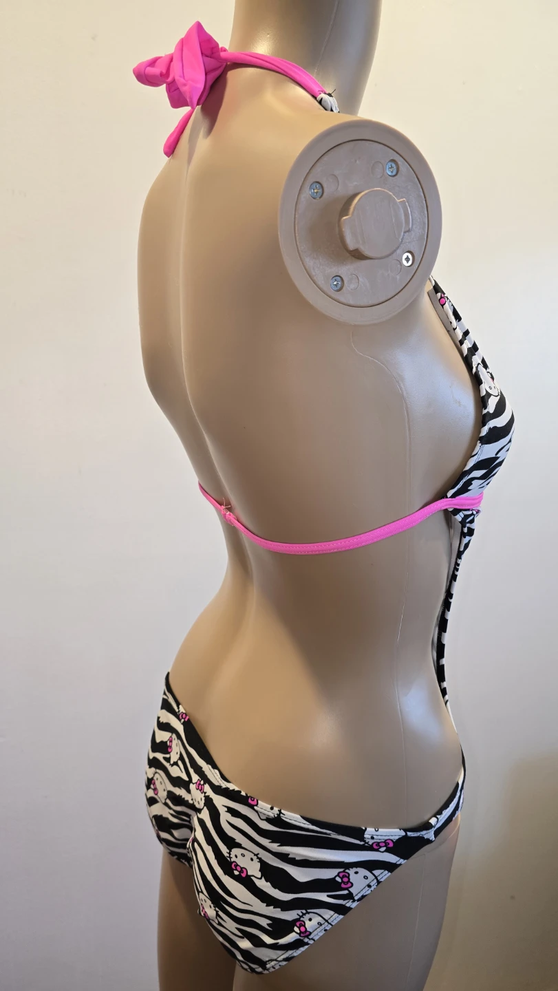 Hello Kitty swimsuit! It features a fun zebra print with Hello Kitty faces all over. The swimsuit is a size large children's will fit an extra small women's has pink trim. Licensed Sanario