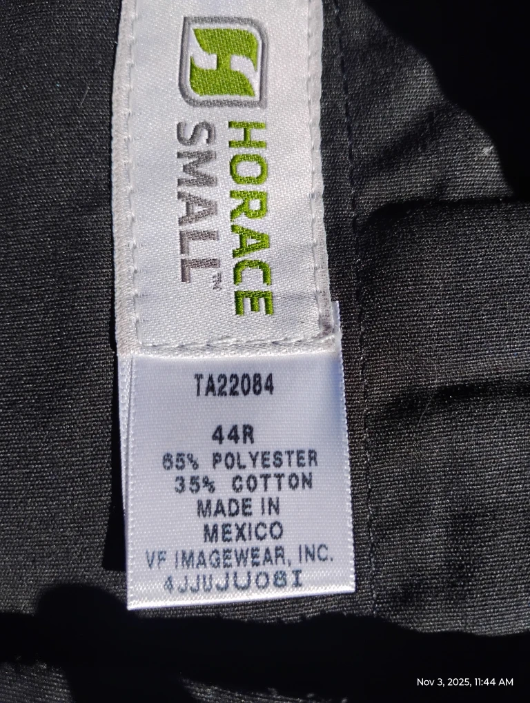 Here are some Horace Small pants in size 44R! They feature a blue stripe down the side and are made of 65% polyester and 35% cotton