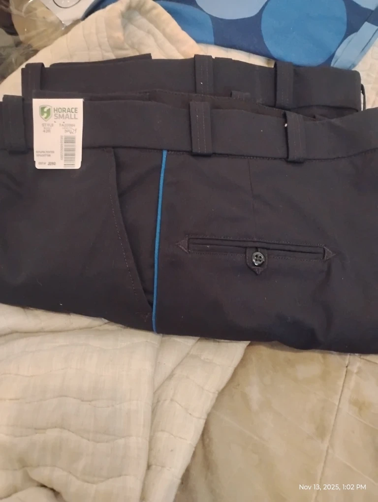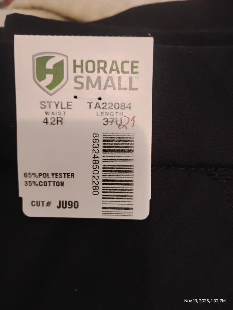 Here are some Horace Small dress pants in great condition! They are a size 42R waist and made of 65% polyester and 35% cotton. The style number is TA22084.