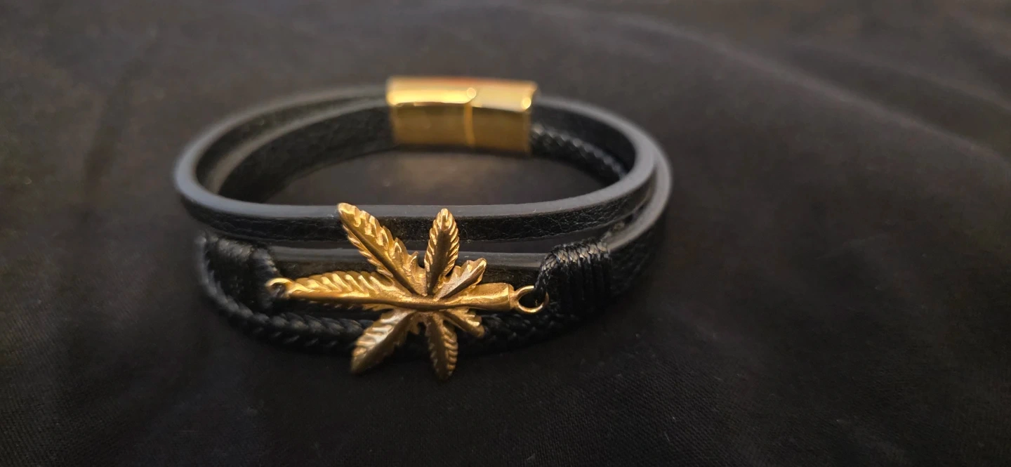 Selling a stylish leather bracelet featuring a unique gold leaf charm. It's a multi-strand design with a magnetic clasp, perfect for adding a touch of flair to any outfit!