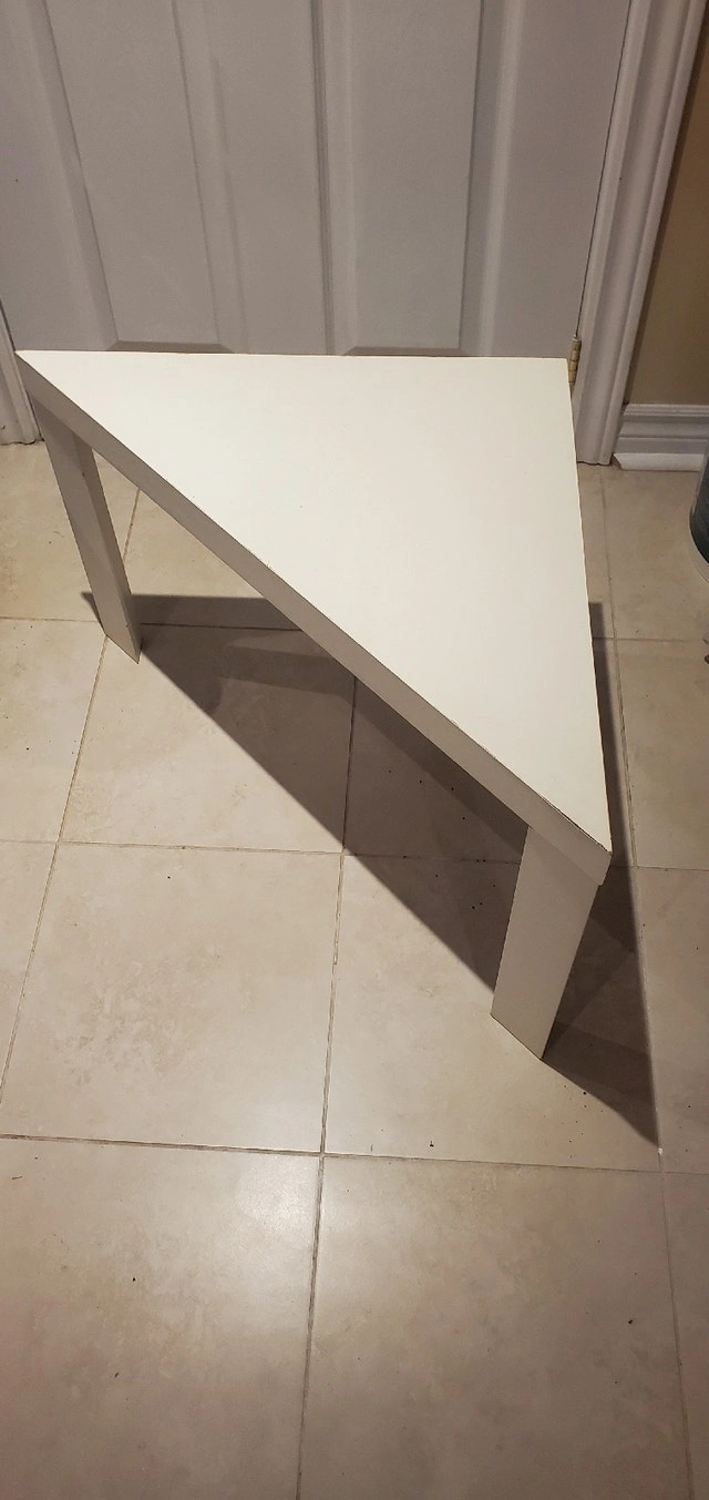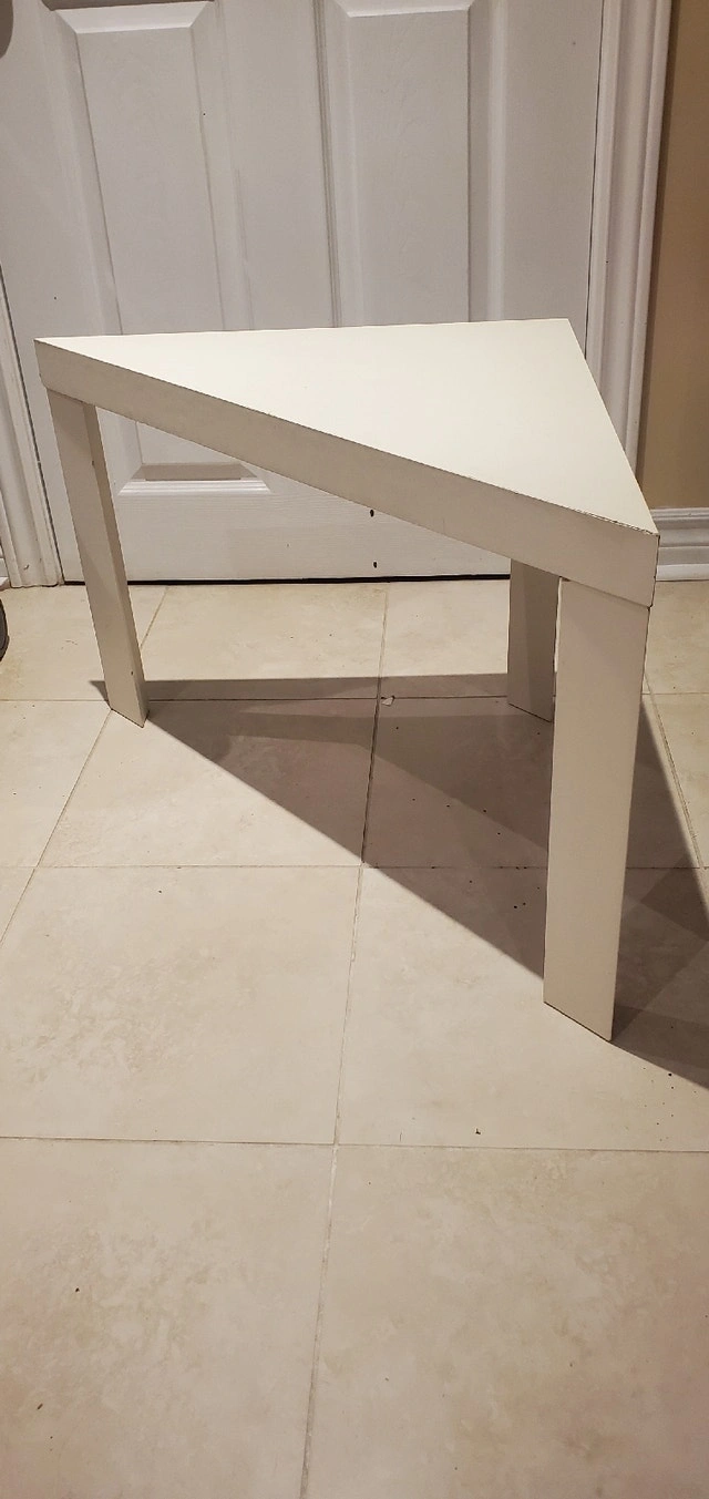 Brown coffee table for sale. Very good condition, sturdy. Dimensions length, 20 in, width 18 in, height 18 in. $15. White corner table $10. Length 30 in, width 22 in, height 18 inches, $10. Great for home or cottage. Call/text 416 5593166.
