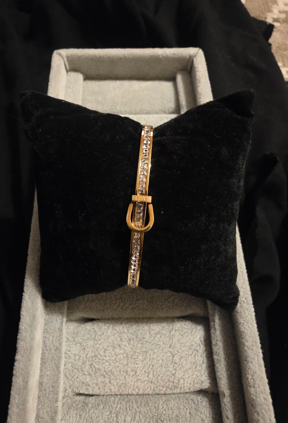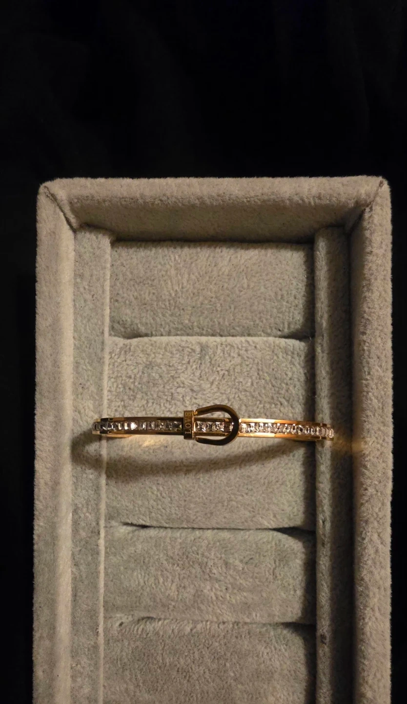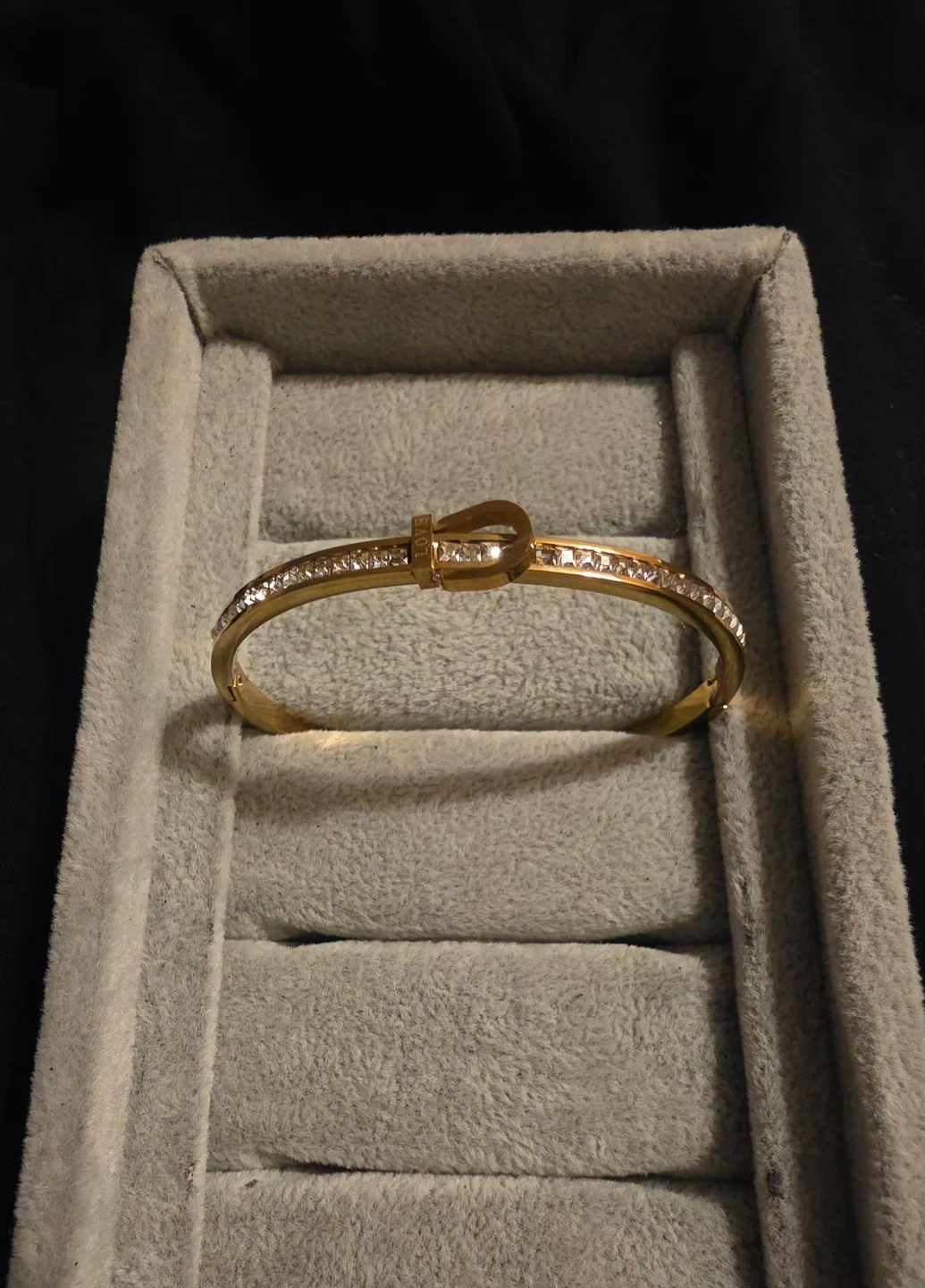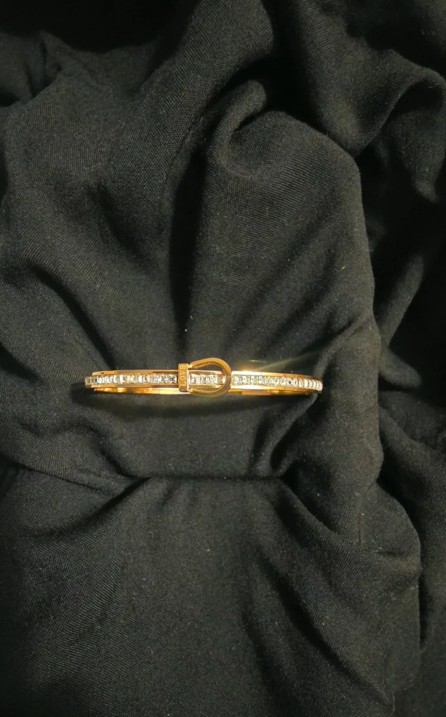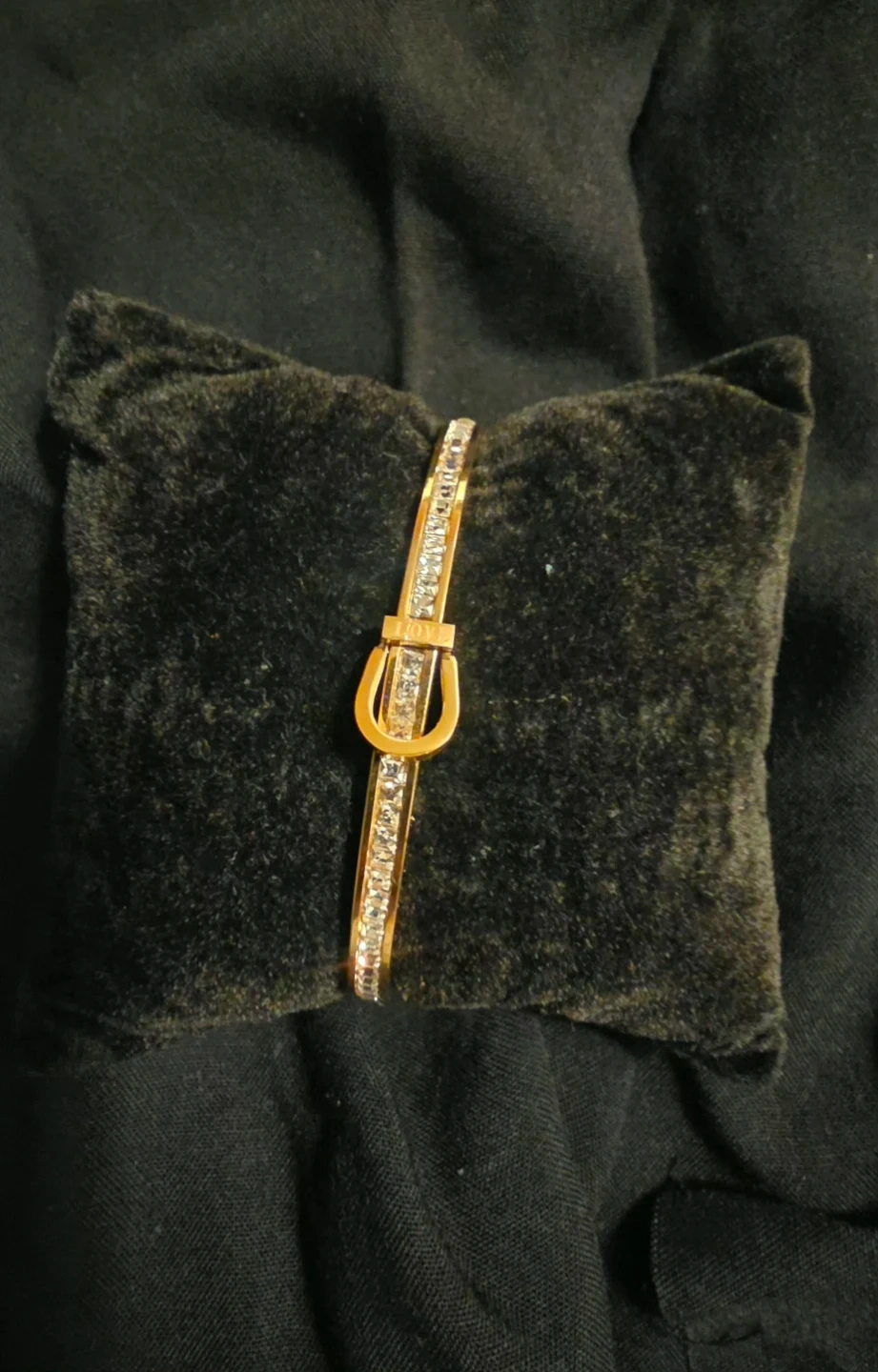 Selling a gold-tone bangle bracelet featuring a buckle design and crystal accents. It's in great condition and ready to add a touch of sparkle to your wrist!