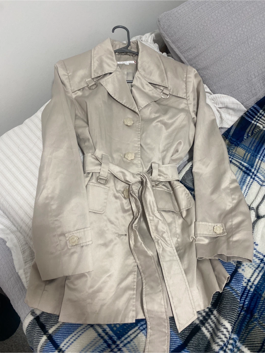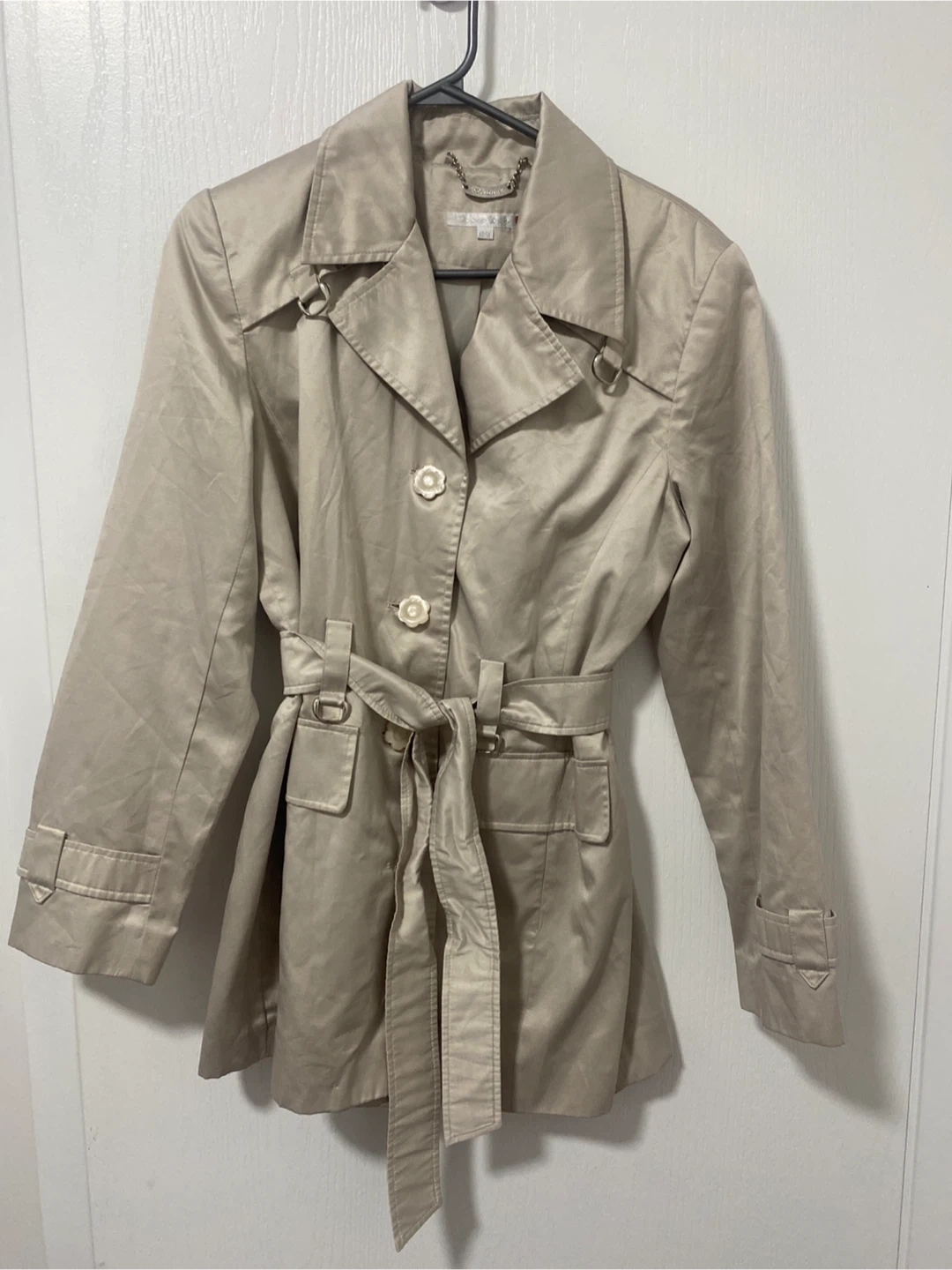 Selling a trench coat in a lovely beige colour. It features a belted waist and button closure. Perfect for spring or fall!