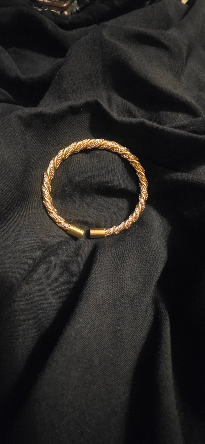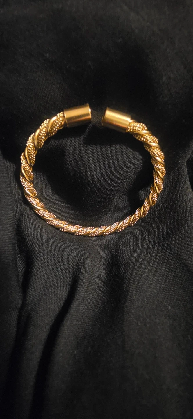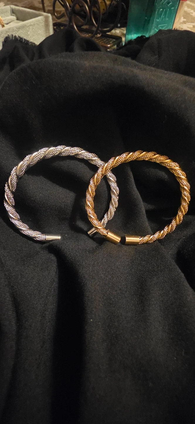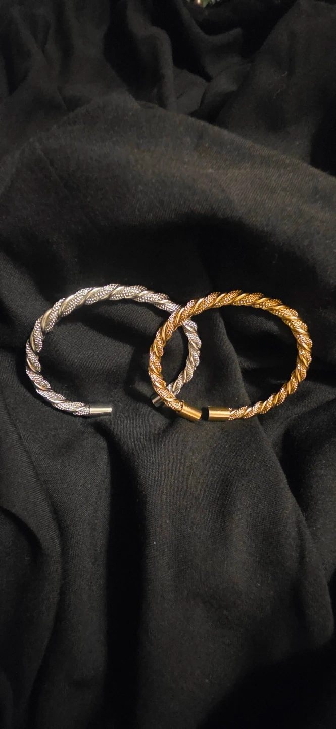 Selling a pair of twisted bangle bracelets. One is gold and the other is silver. They have a unique design. Stainless steel