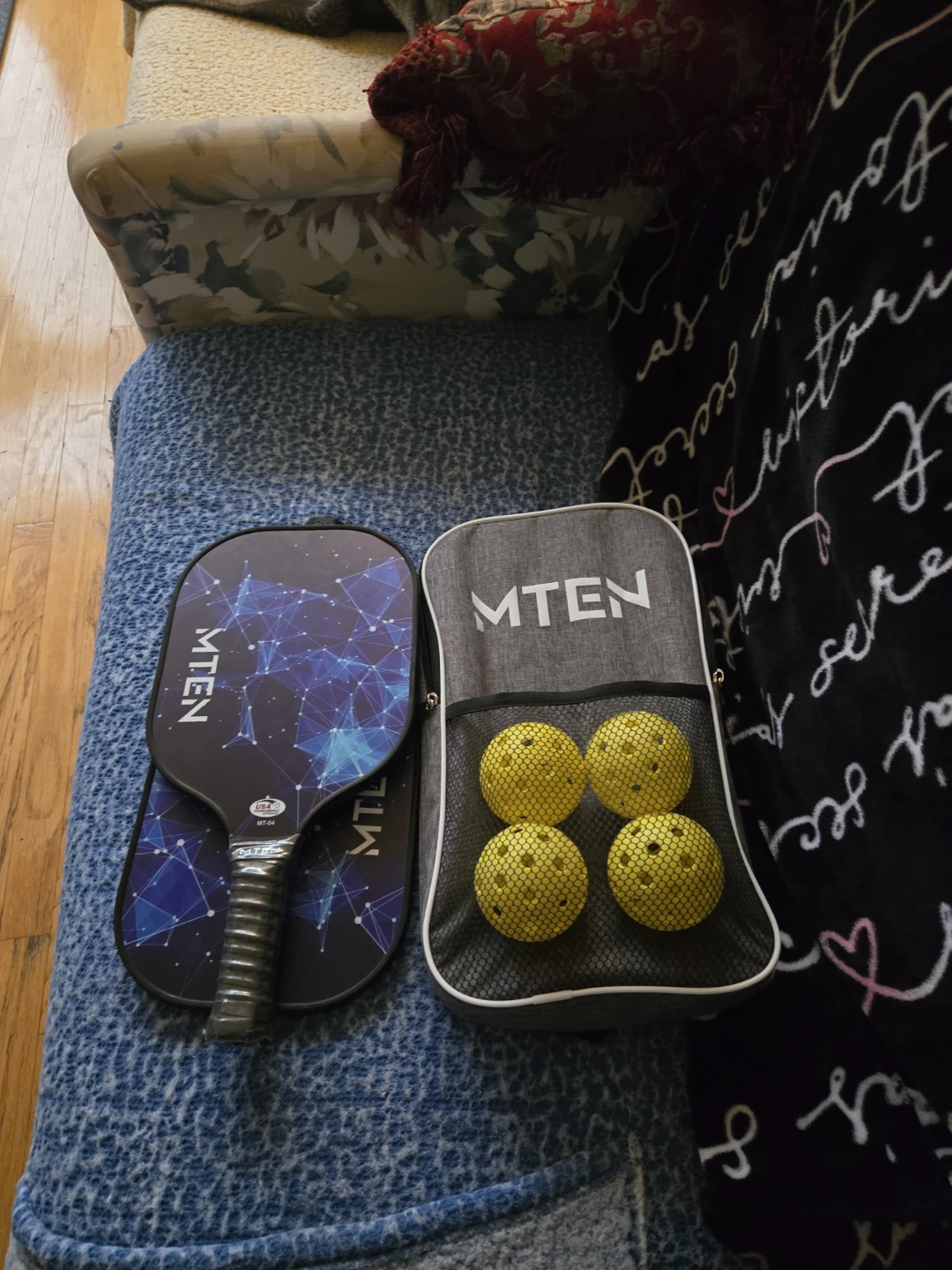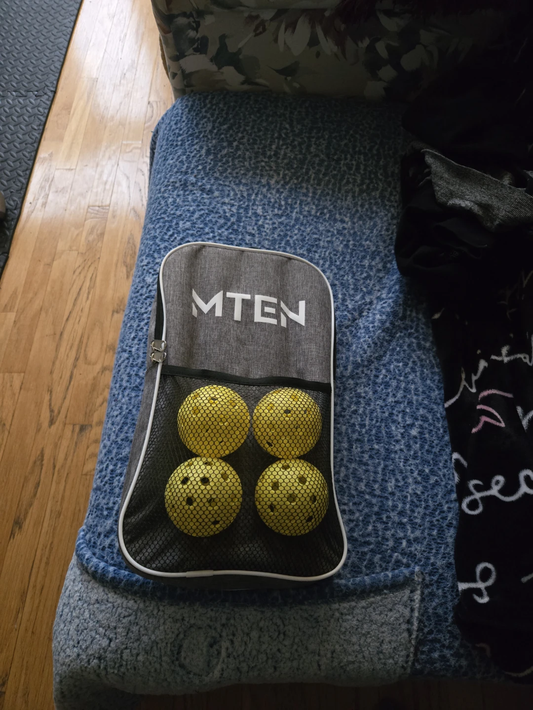 Selling a MTEN pickleball paddle with a cool design! Also included are four yellow pickleballs and a carrying bag to keep everything together. Great set for starting out or upgrading your gear
