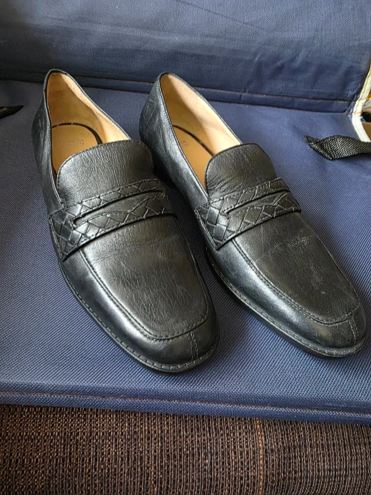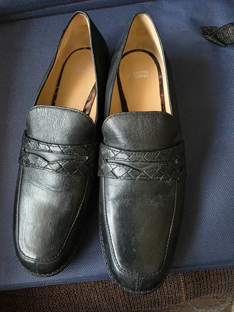 Classic black leather loafers from Johnston & Murphy! These are a stylish and comfortable choice for everyday wear. They have a woven design across the top. Perfect for adding a touch of sophistication to your outfit