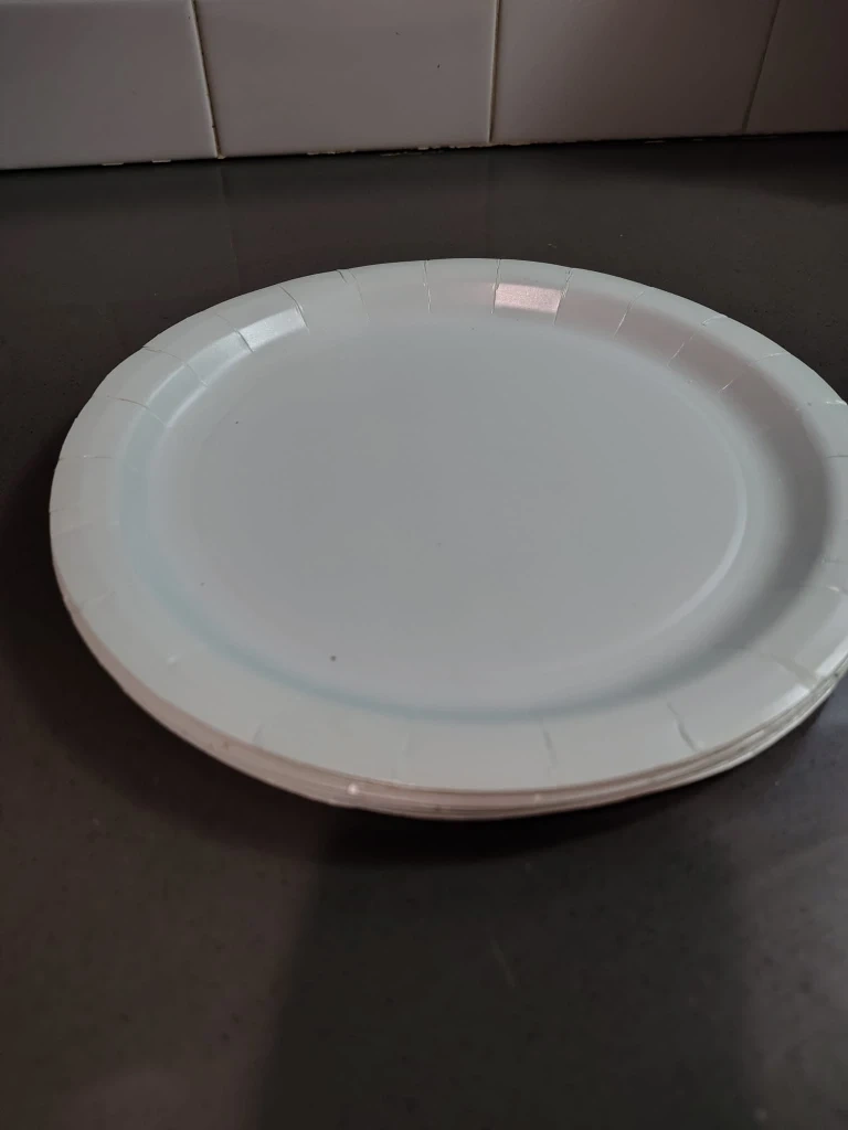 Selling a stack of paper plates. They're perfect for parties, picnics, or any occasion where you need disposable tableware